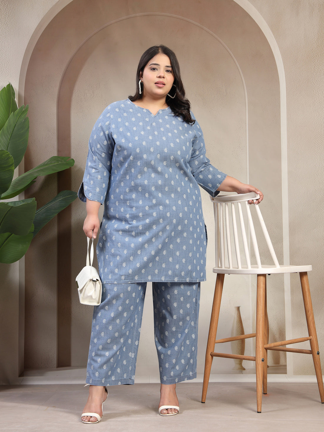 Plus Size Light Blue Mandarin Collar Cotton Denim Co-Ords Set