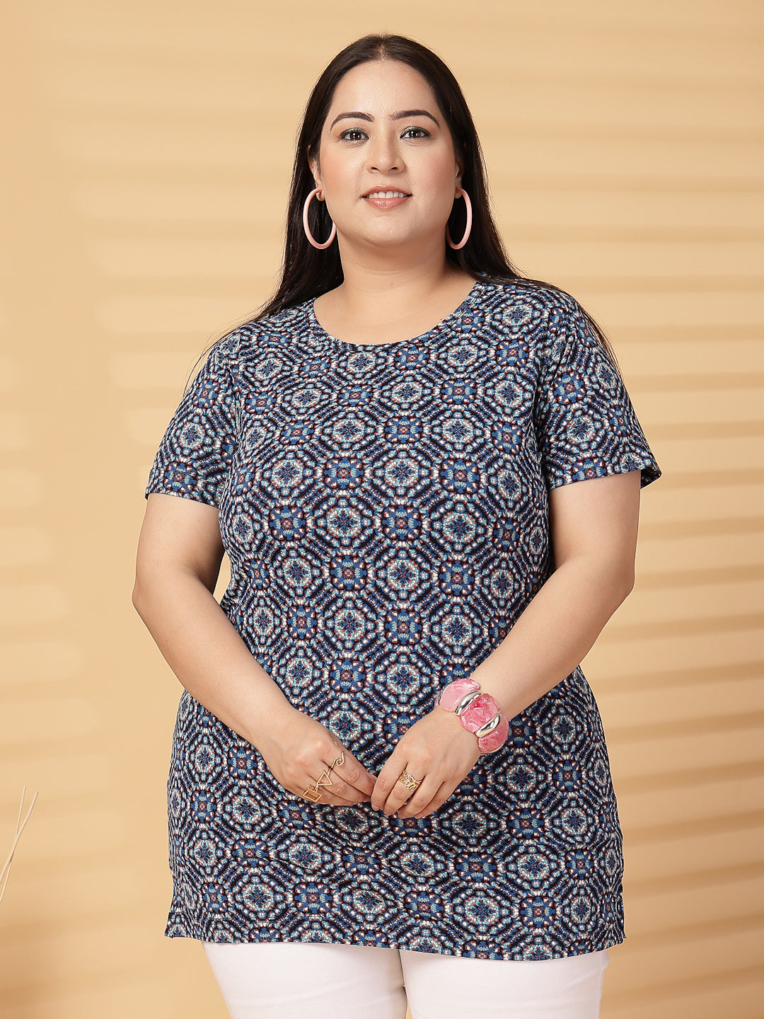 Navy blue Tshirt for women Geometric printed Regular length Round neck Short, cap sleeves Knitted...