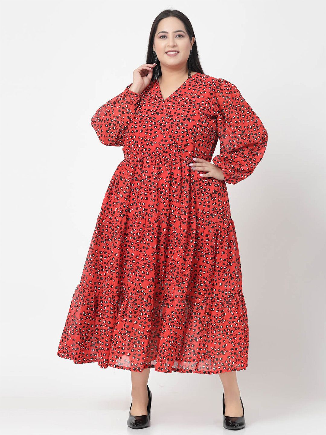 Plus Size Orange & Black Abstract Printed V-Neck Puff Sleeves Fit & Flare Dress