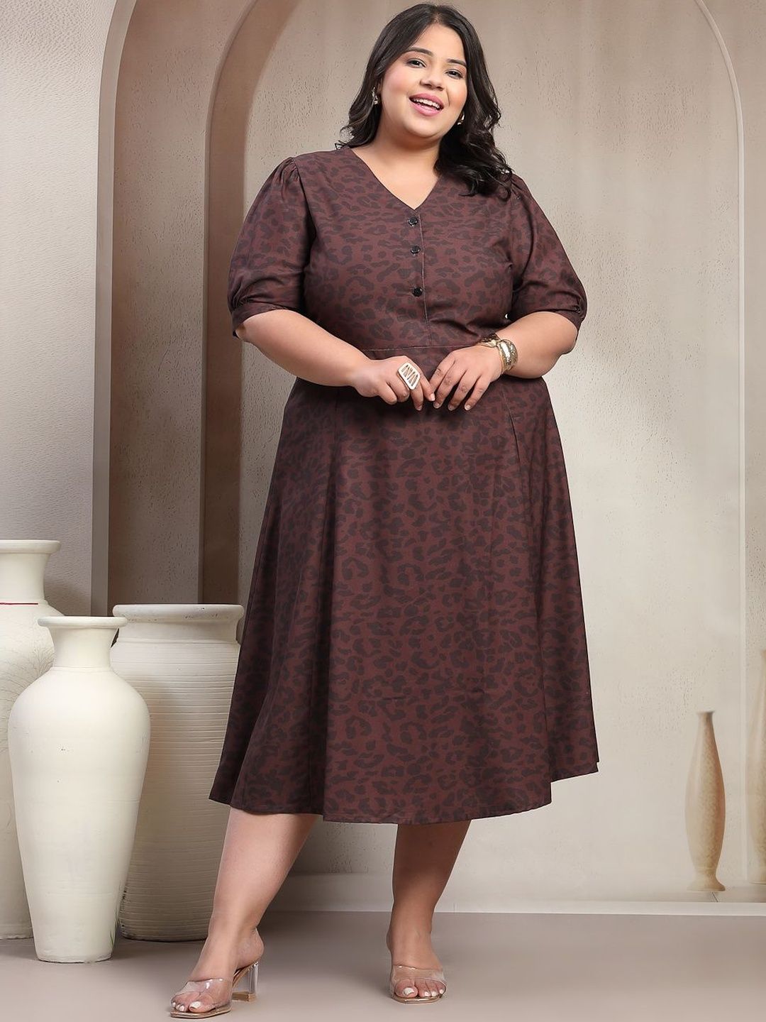 Plus Size Brown & Beige Animal Printed V-Neck Puff Sleeve Fit & Flare Dress