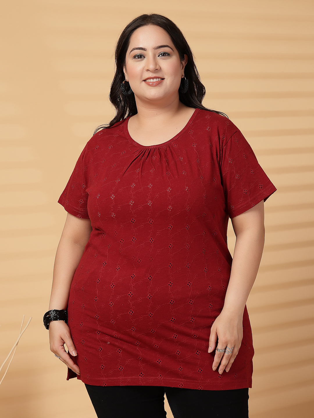 Maroon Tshirt for women Solid Regular length Round neck Short, cap sleeves Knitted cotton fabric...
