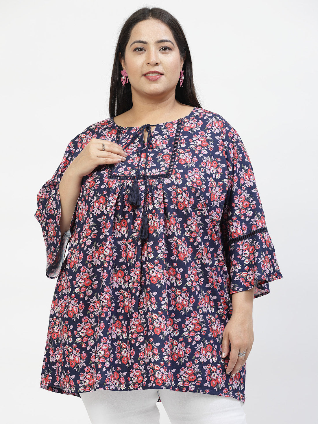 Plus Size Floral Print Tie-Up Neck Bell Sleeve Top