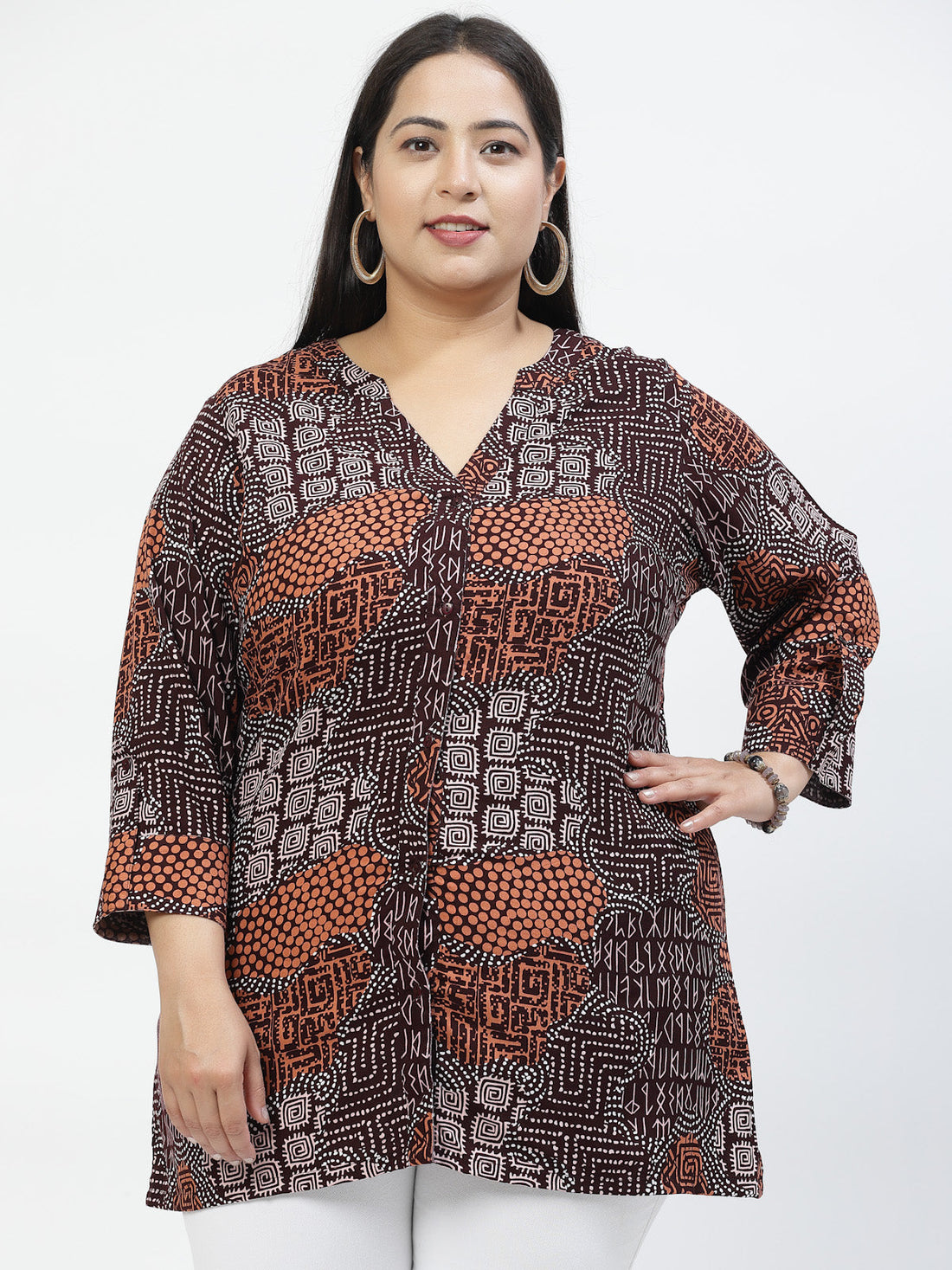 Plus Size Print Mandarin Collar Top