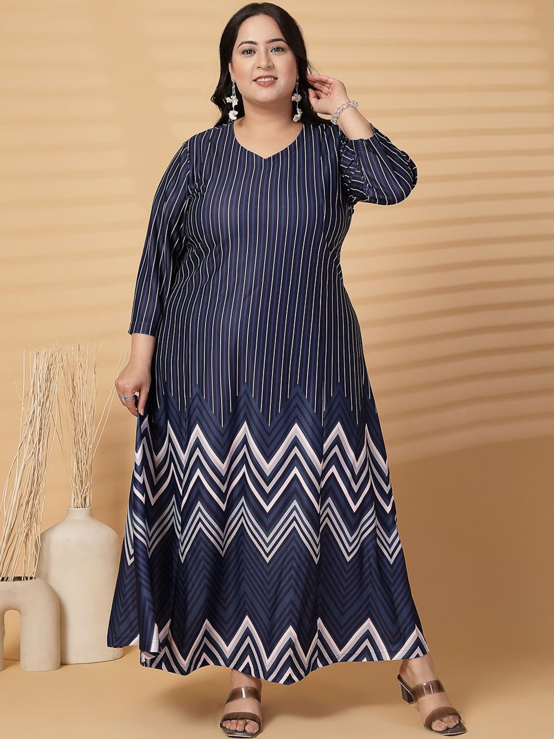 Navy blue abstract print fit & flare dress V neck 3/4th sleeves length in flared...