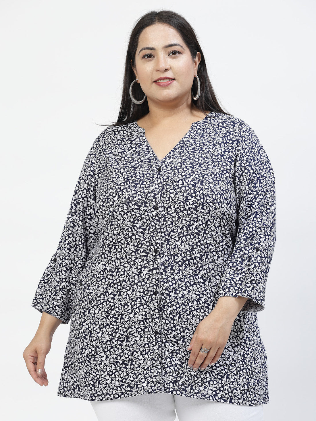 Plus Size BlueWhite Floral Printed Round Neck Cotton T-shirt