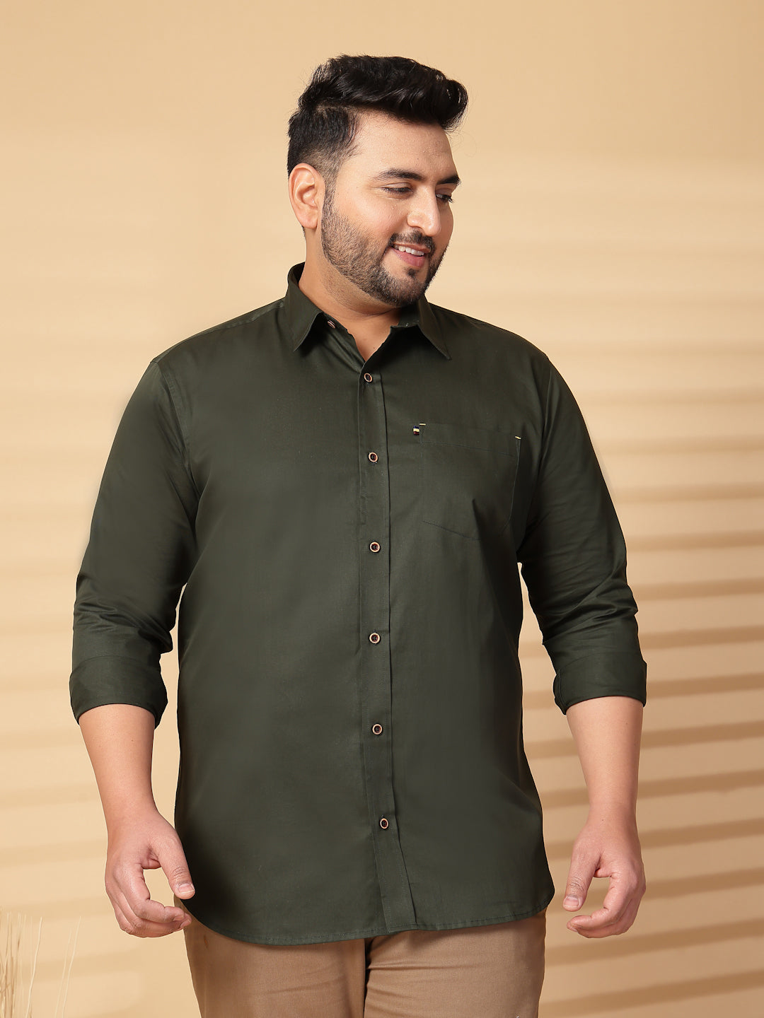 Olive opaque casual shirt for menSpread collarButton placketPatch pocketLong sleevesCurved hemline