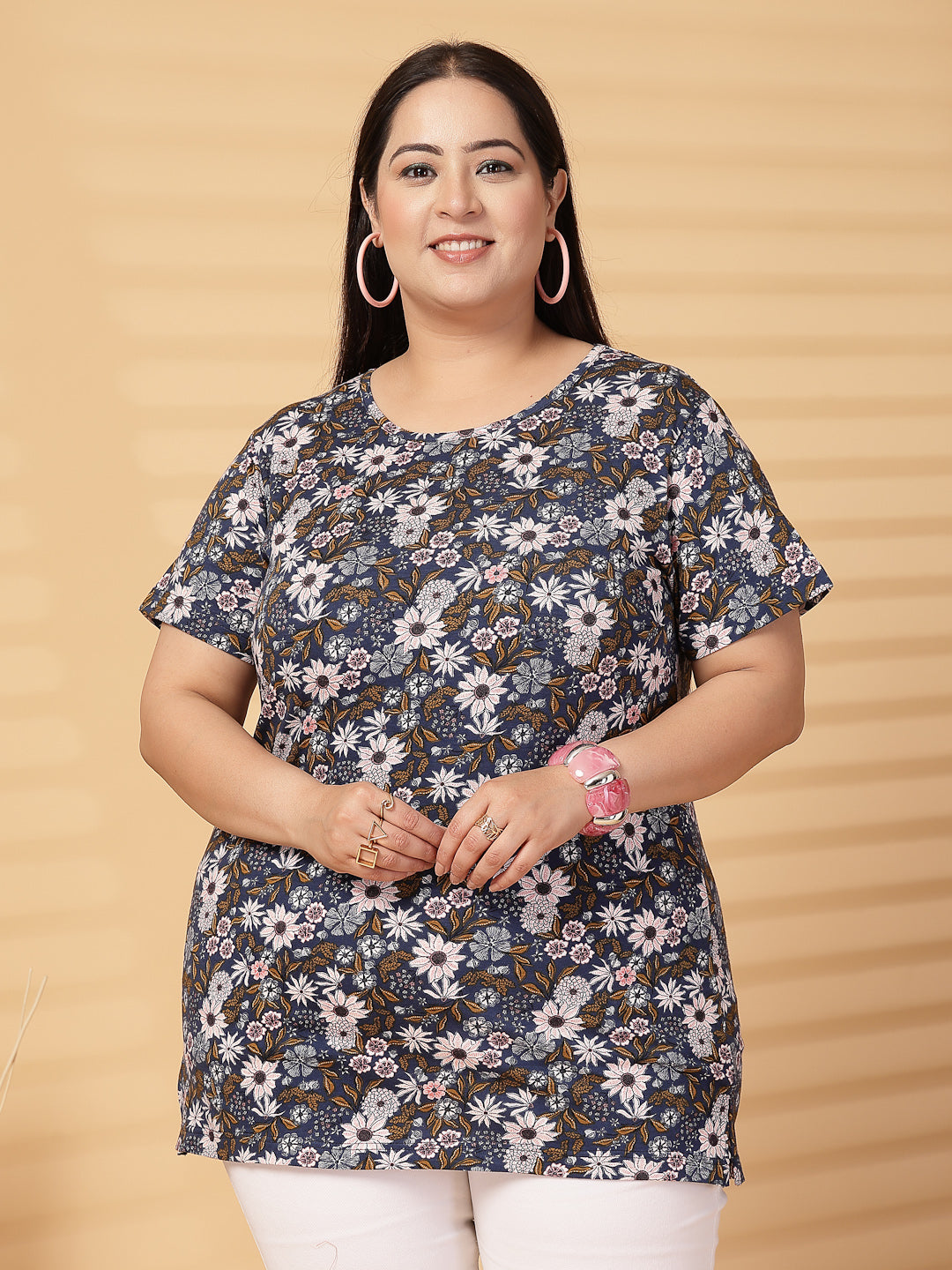Navy blue Tshirt for women Floral printed Regular length Round neck Short, cap sleeves Knitted...