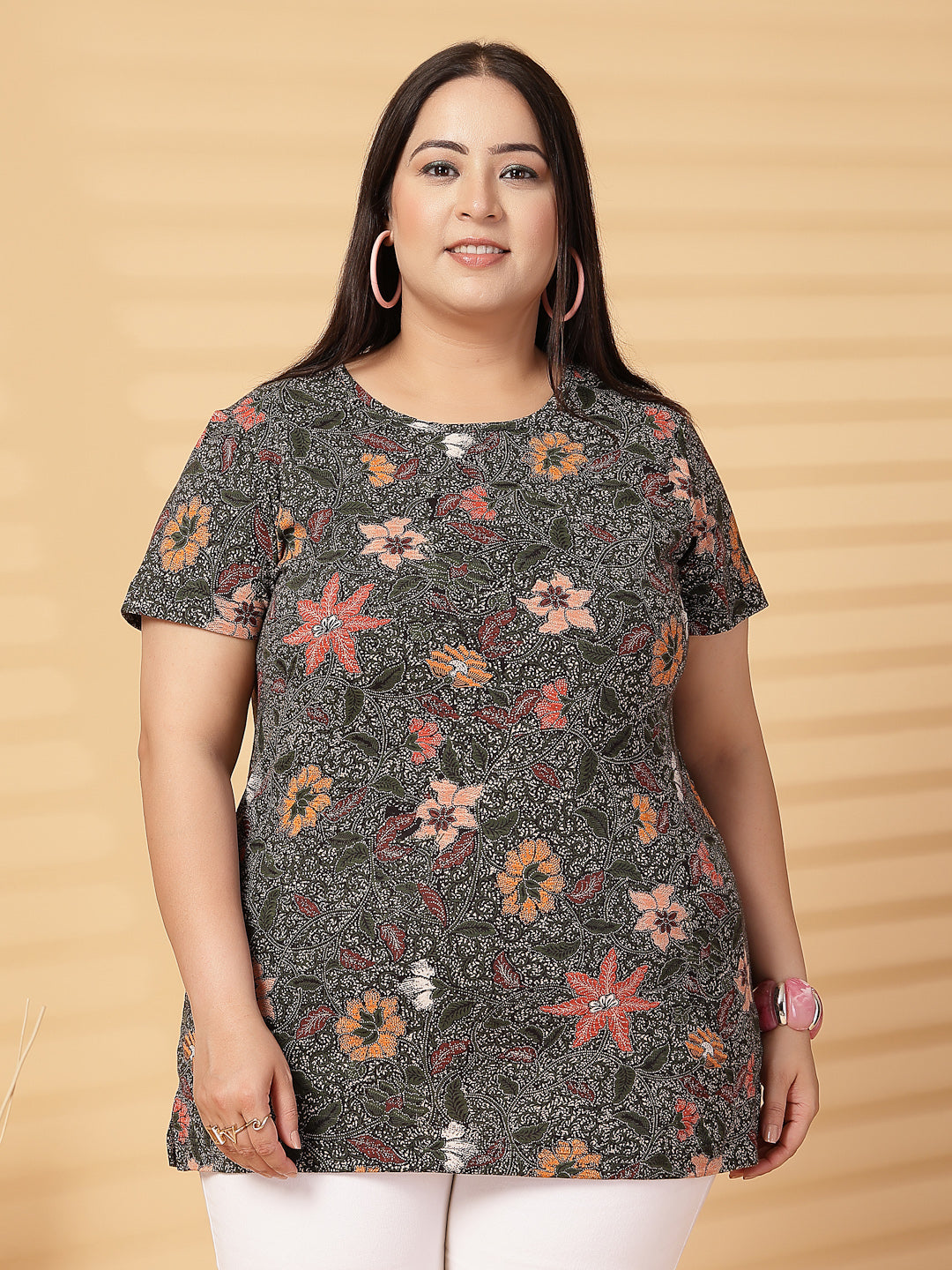 Black Tshirt for women Floral printed Regular length Round neck Short, cap sleeves Knitted cotton...