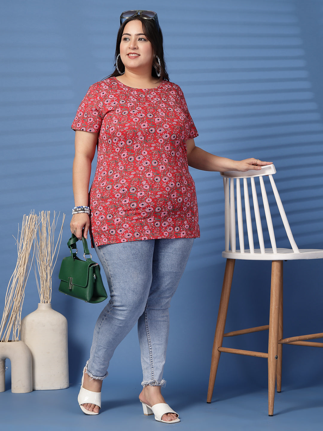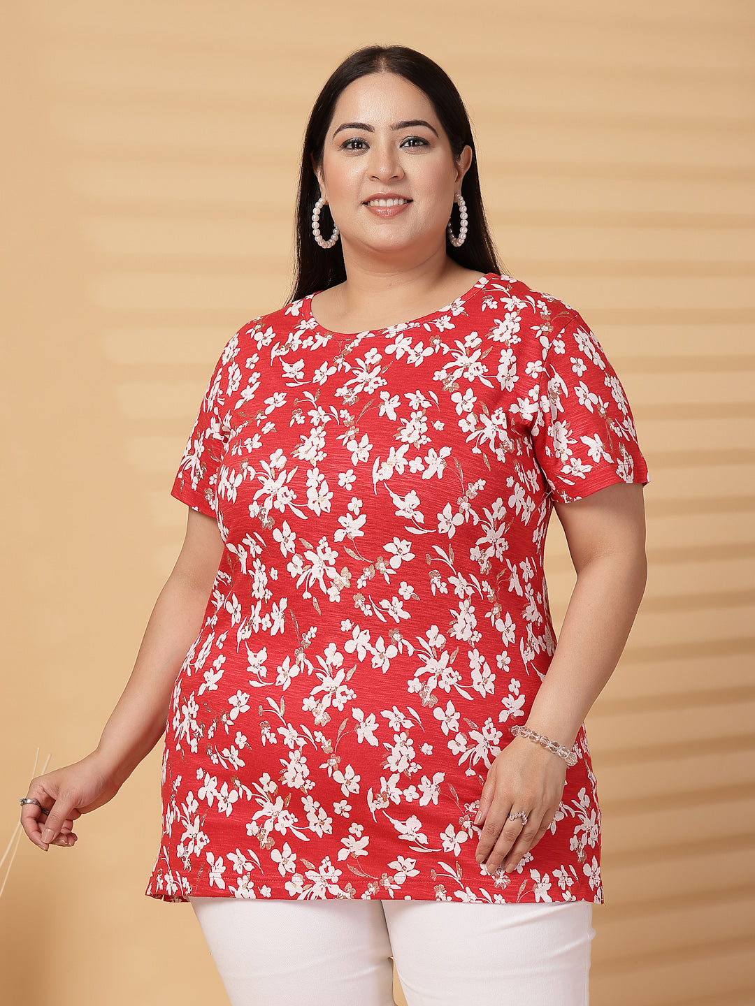 Pink Tshirt for women Floral printed Regular length Round neck Short, cap sleeves Knitted cotton...