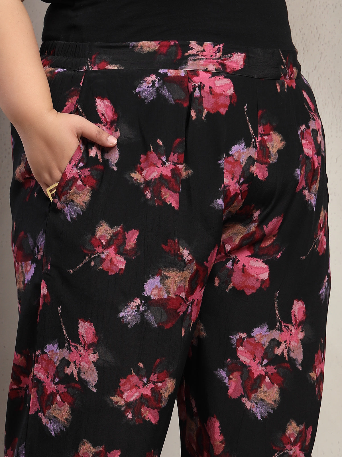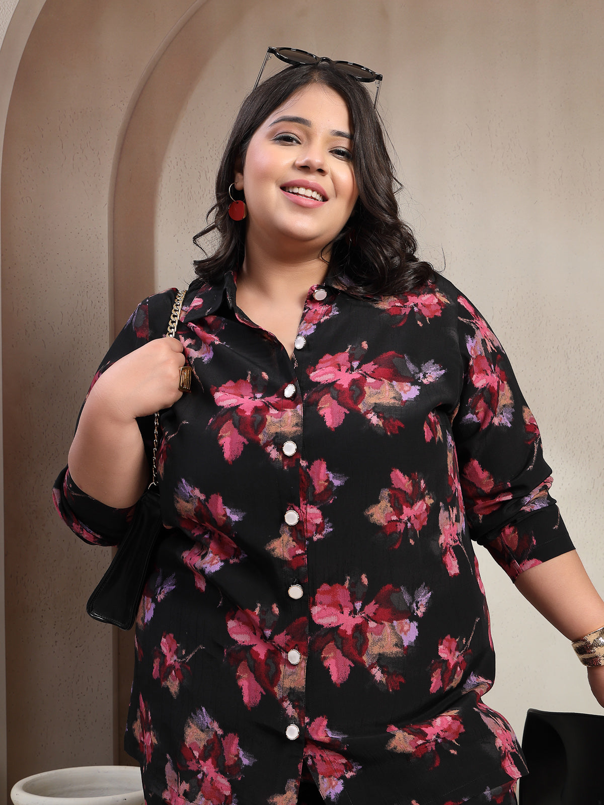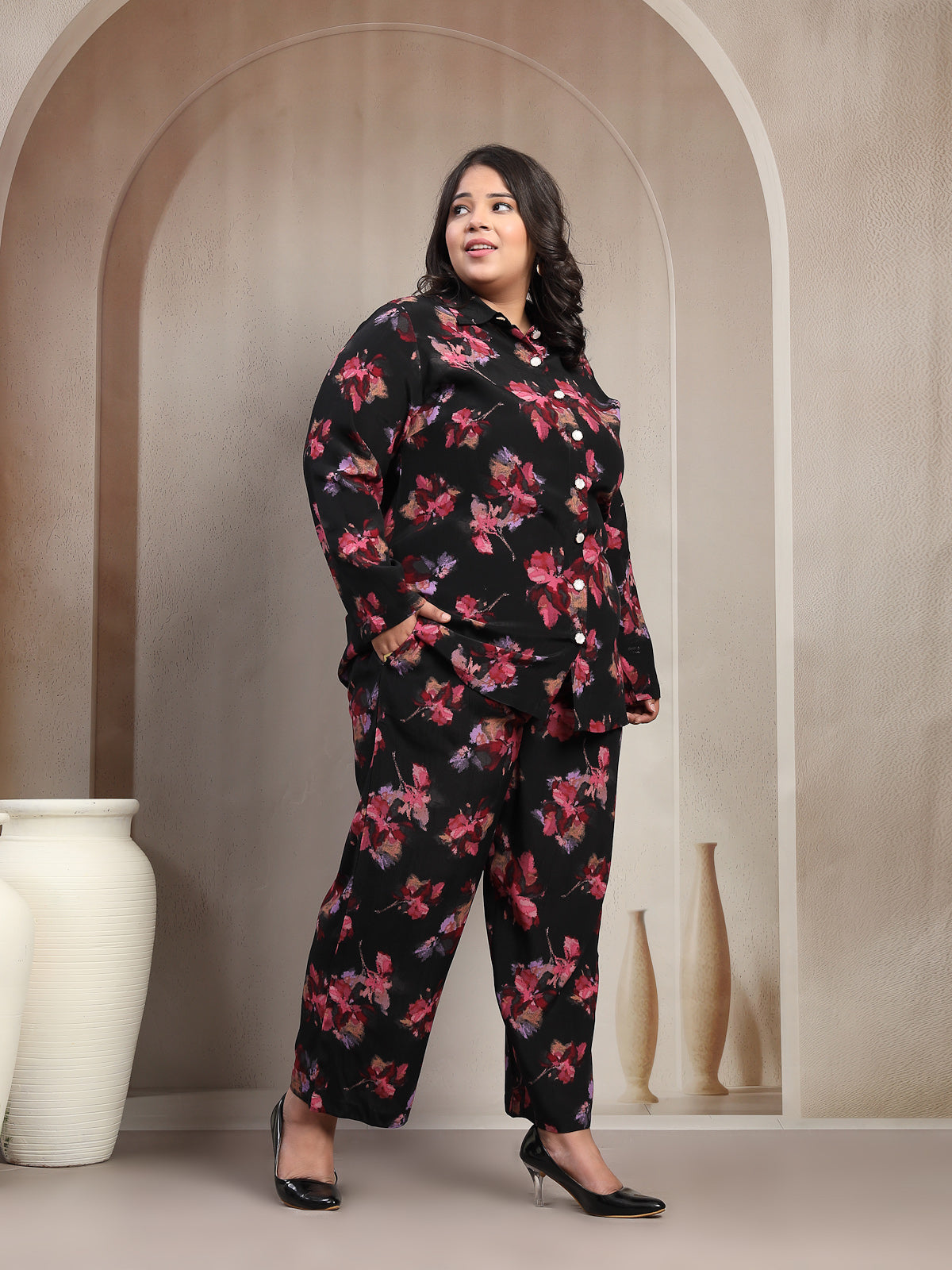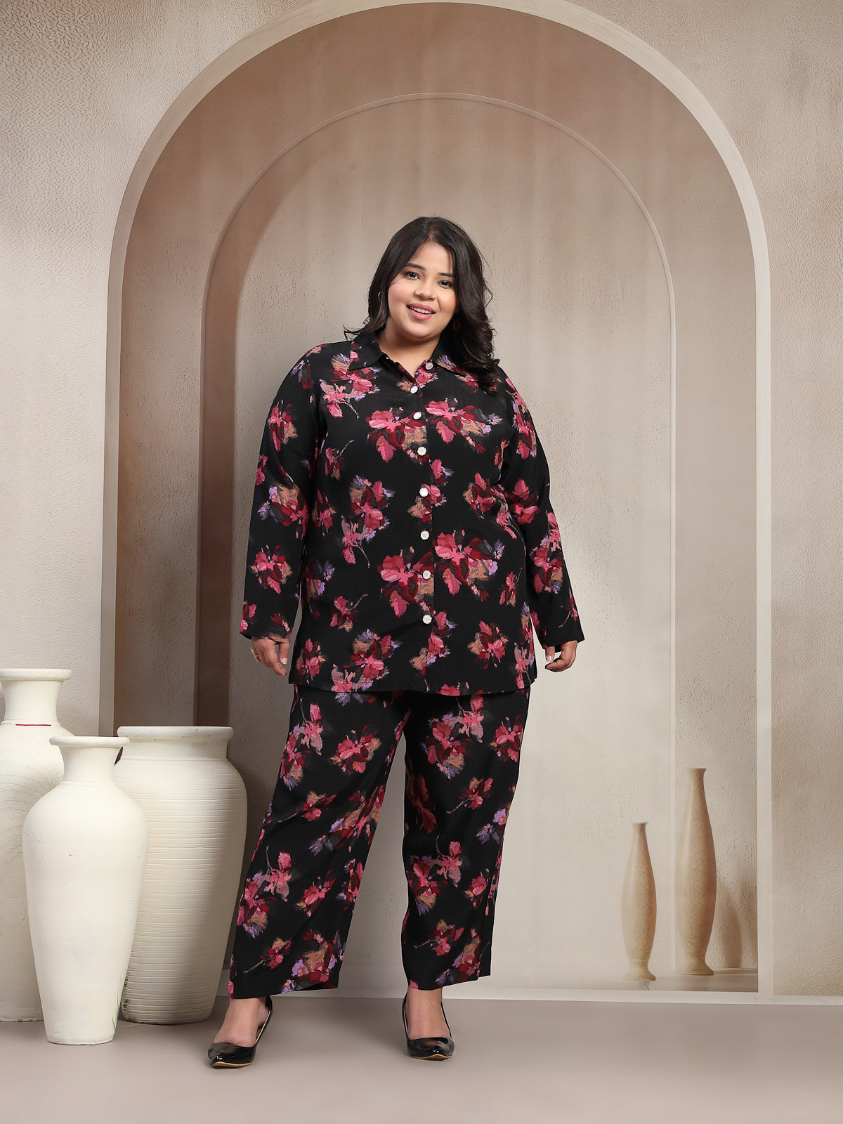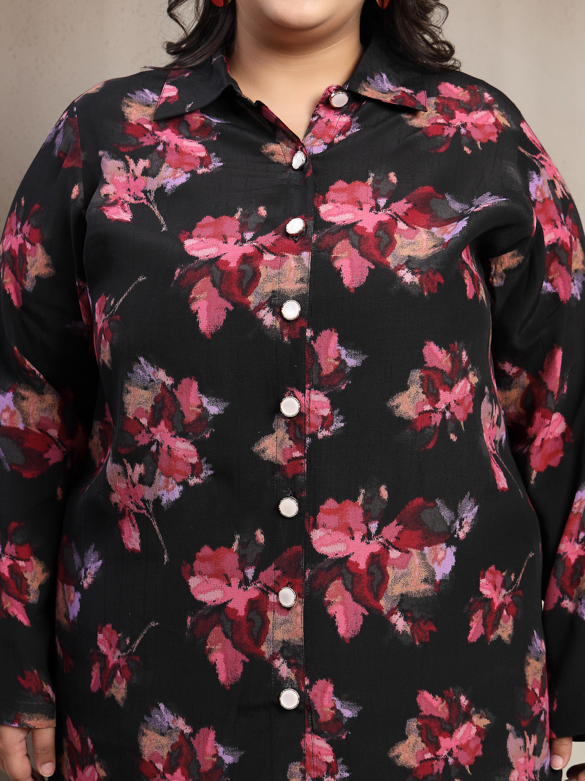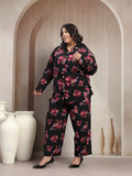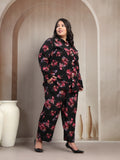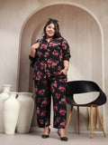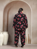Plus Size Black And Red Floral Printed Shirt Collar Tunic With Trousers Co-Ords