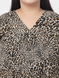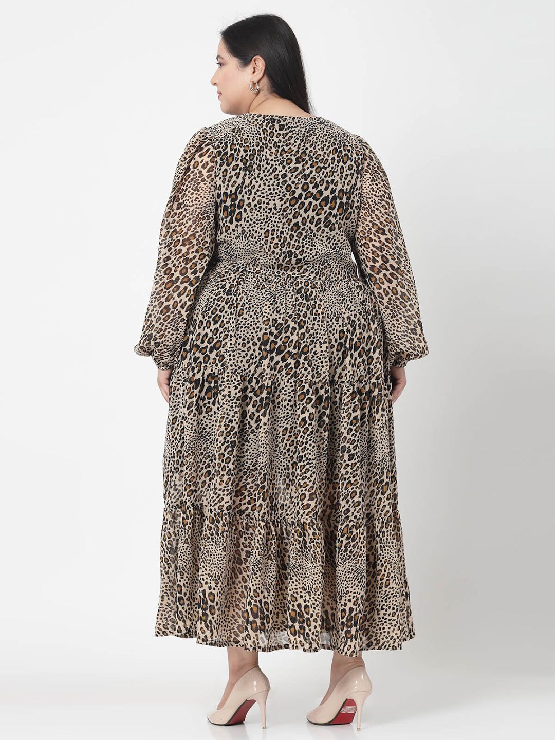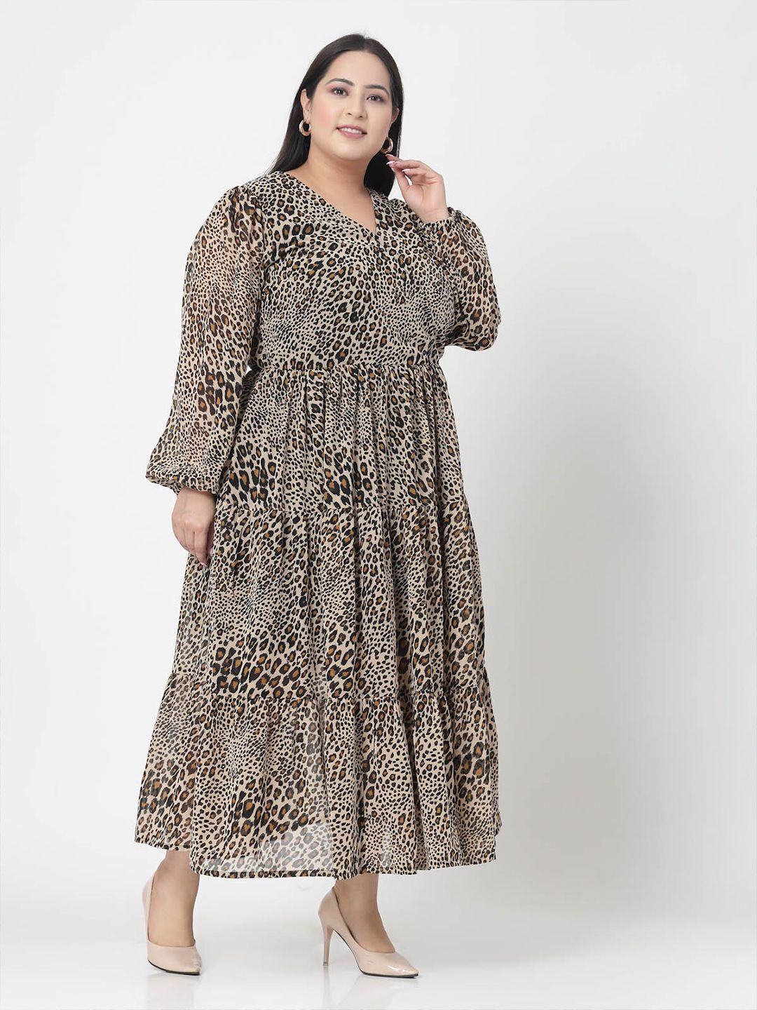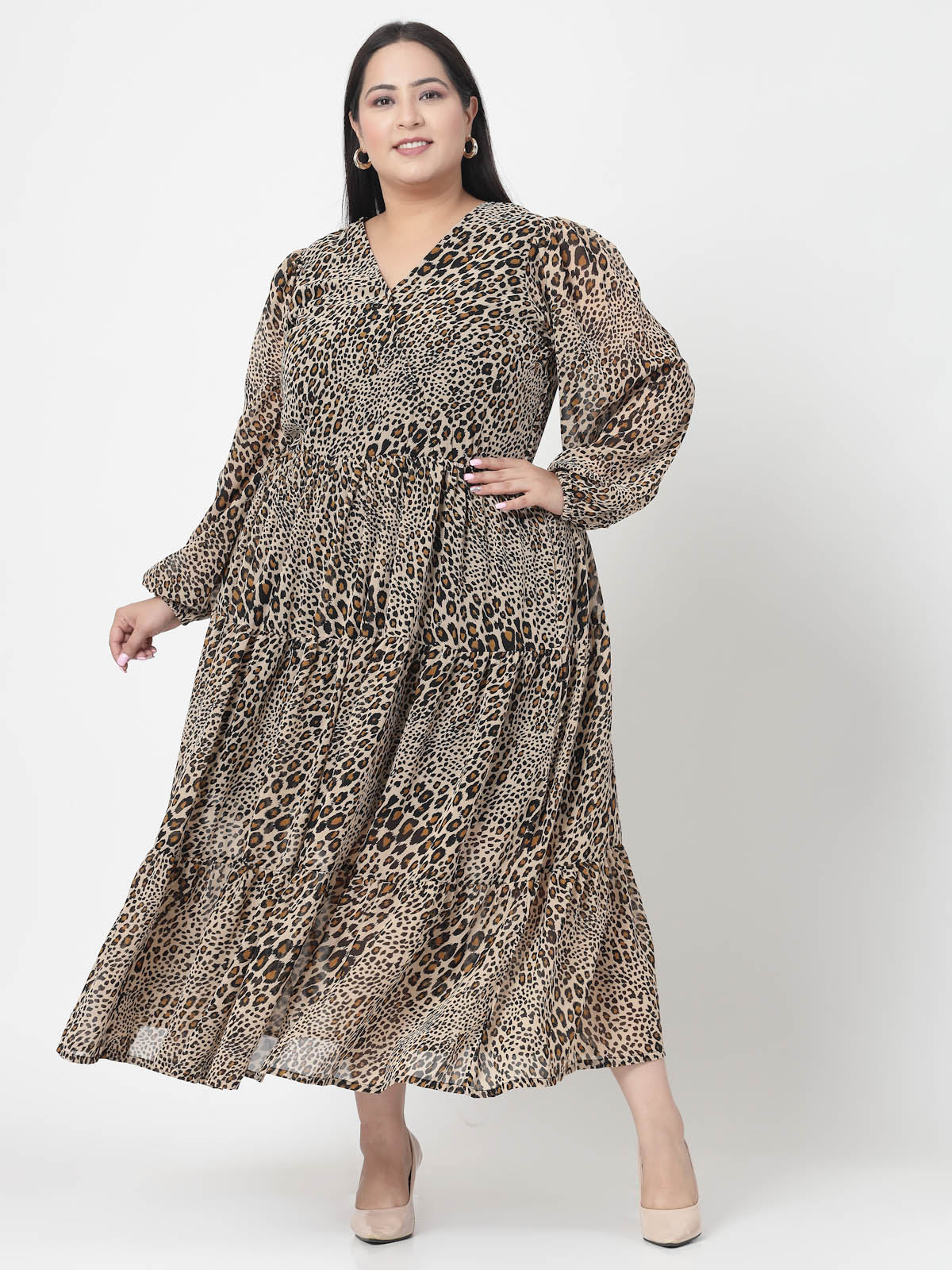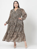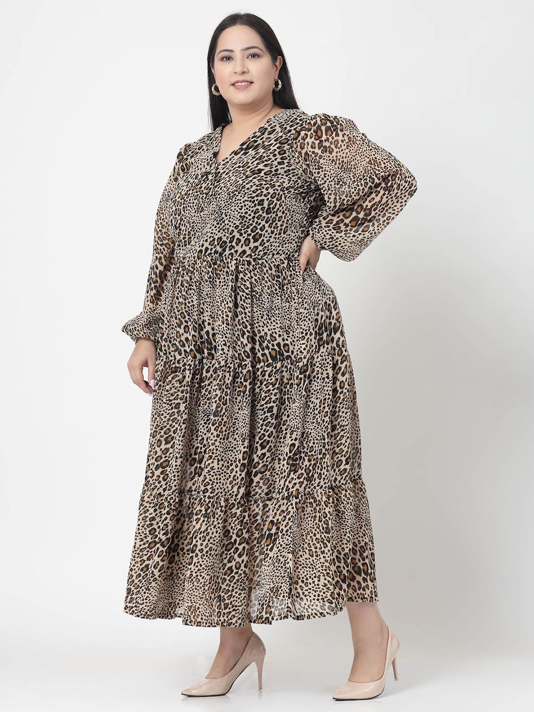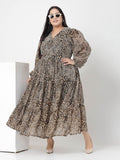 Plus Size Brown & Beige Animal Printed V-Neck Puff Sleeve Fit & Flare Dress