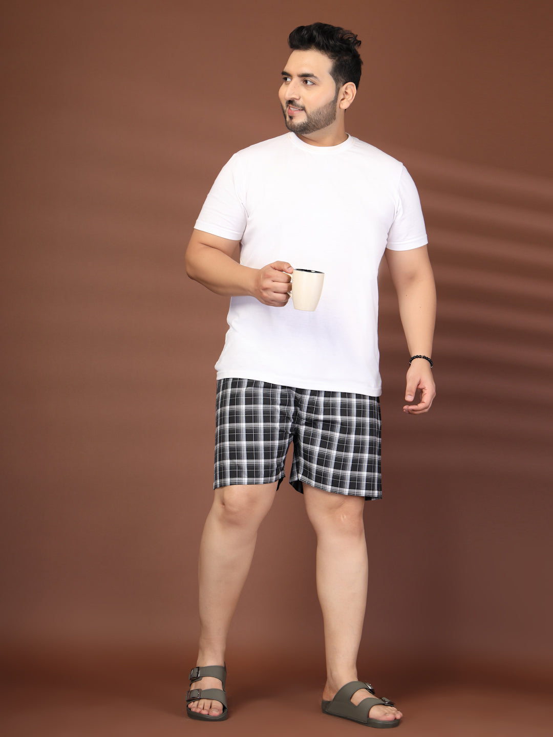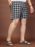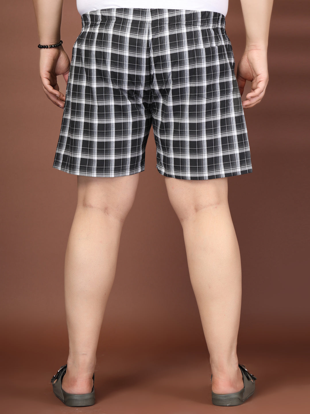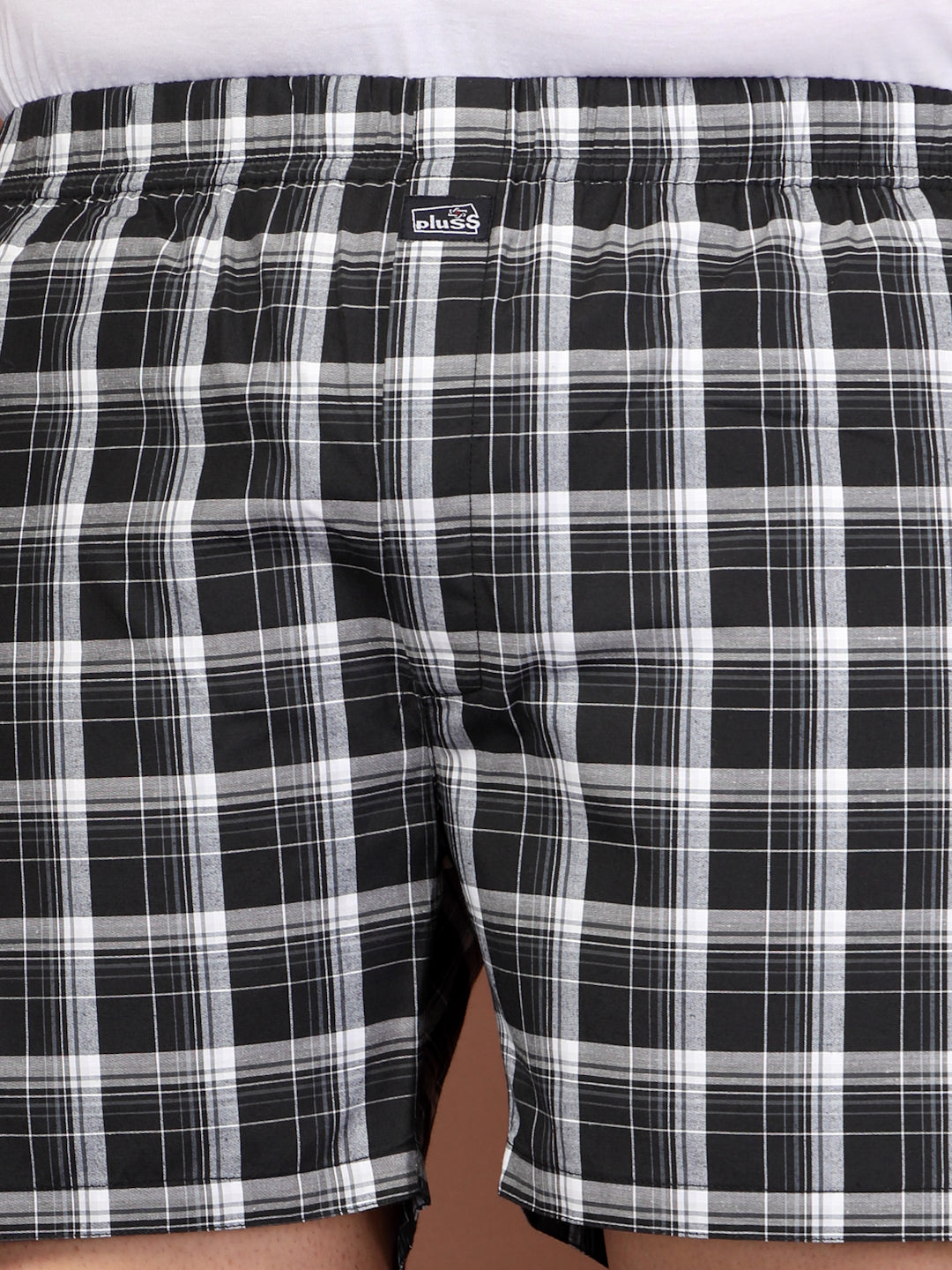 Black checked mid-rise plus-size boxers, has inner elasticated waistband with slip-on closure and one pocket