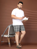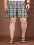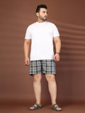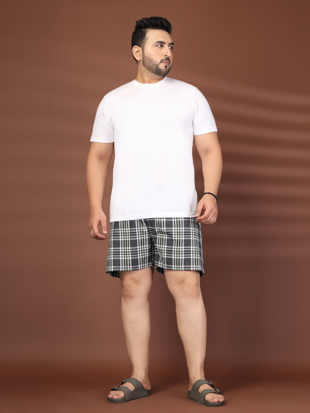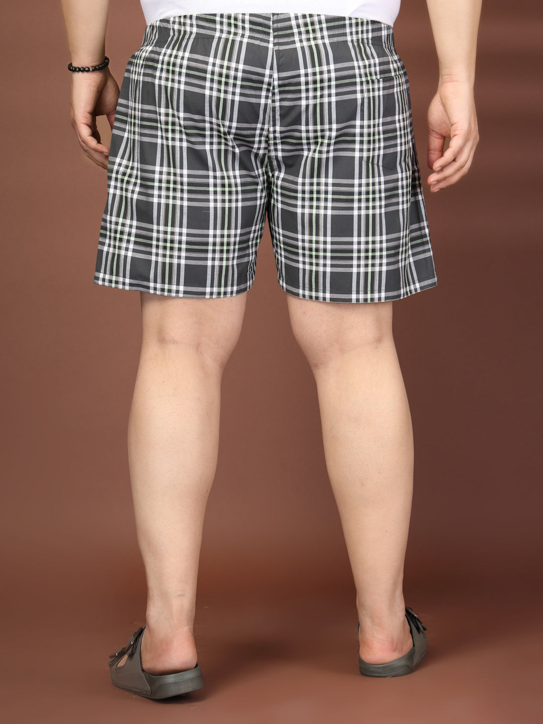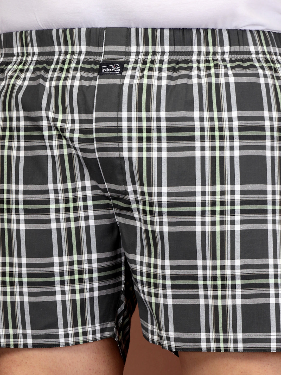 Olive-green checked mid-rise plus-size boxers, has inner elasticated waistband with slip-on closure and one pocket
