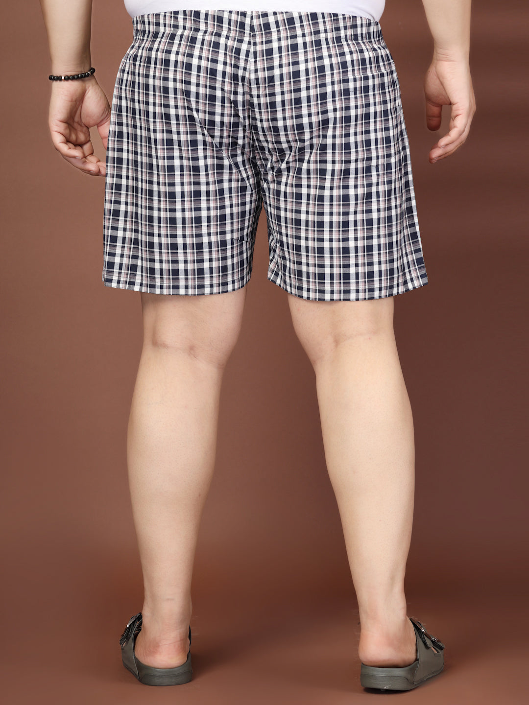 Navy-blue checked mid-rise plus-size boxers, has inner elasticated waistband with slip-on closure and one pocket