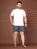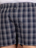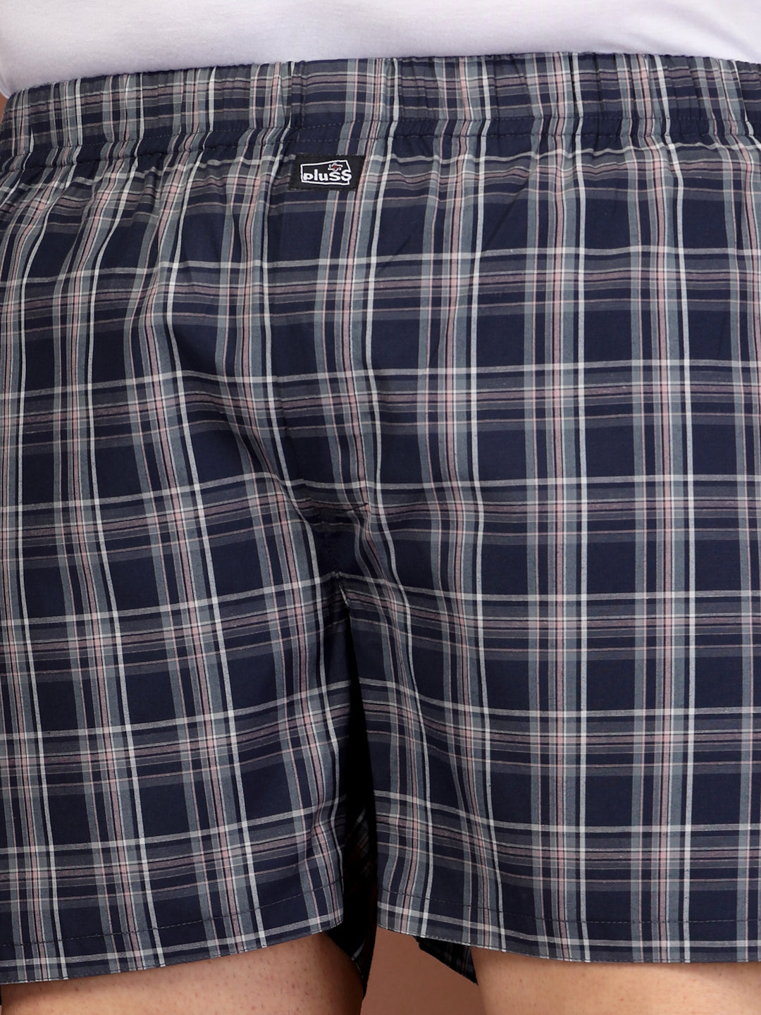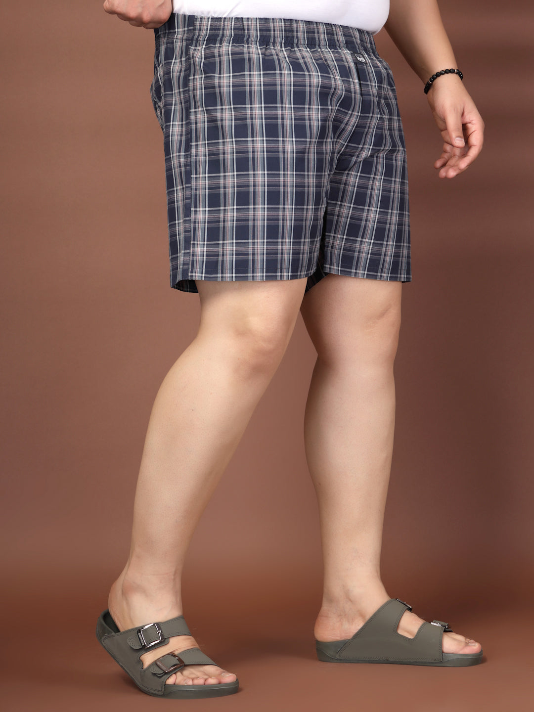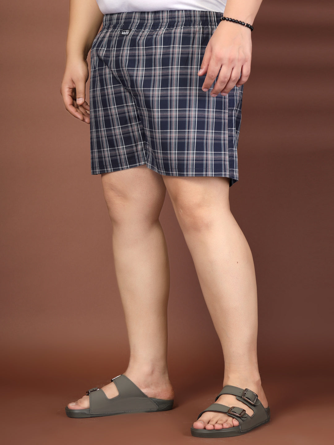 Navy checked mid-rise plus-size boxers, has inner elasticated waistband with slip-on closure and one pocket