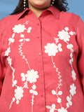 Pink and white embroidered shirt, has a shirt collar neck and long sleeves, secured with button closure