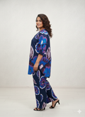 Navy blue, blue and Pink floral patch work trousers, has an elasticated waistband with slip-on closure has 2 pockets
