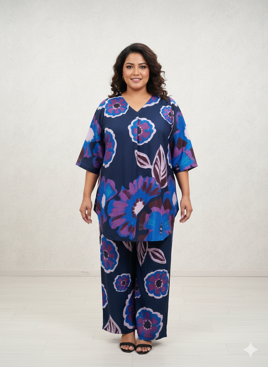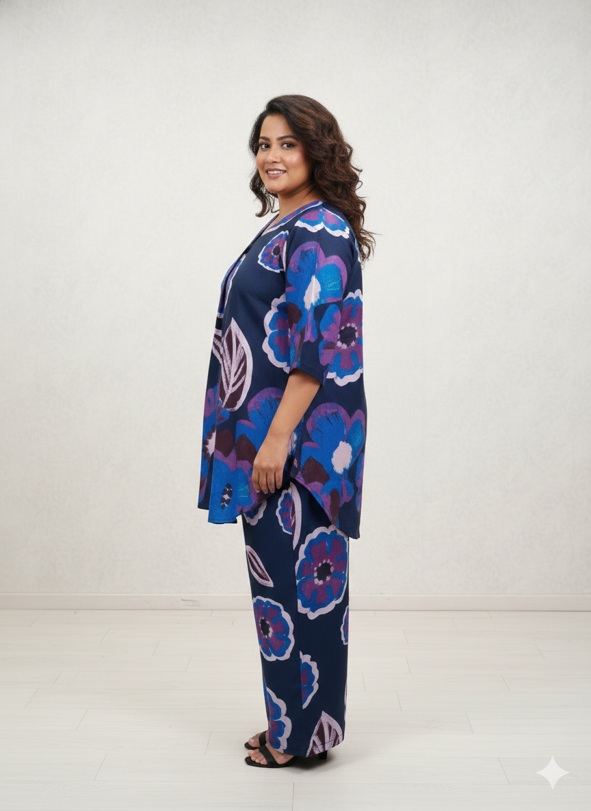 Plus Size Floral Printed V-Neck Three-Quarter Sleeves Tunic With Trouser