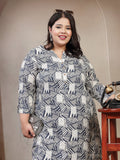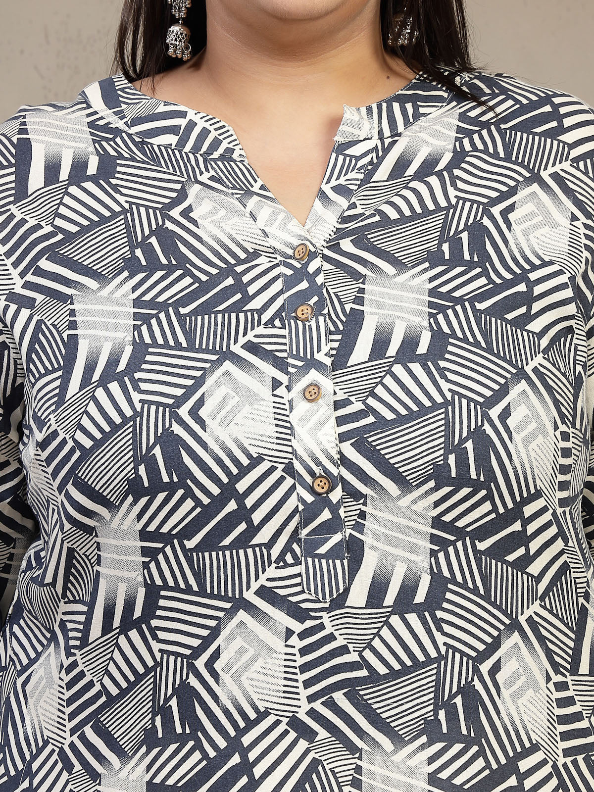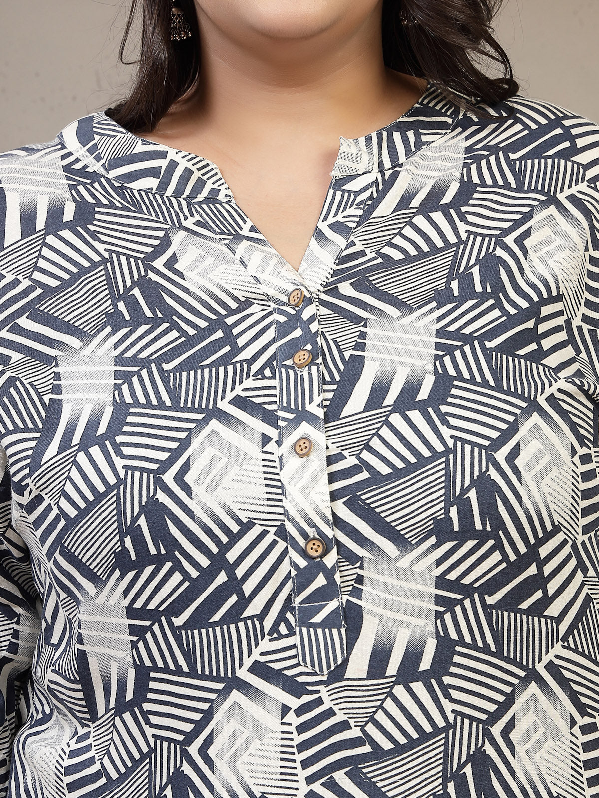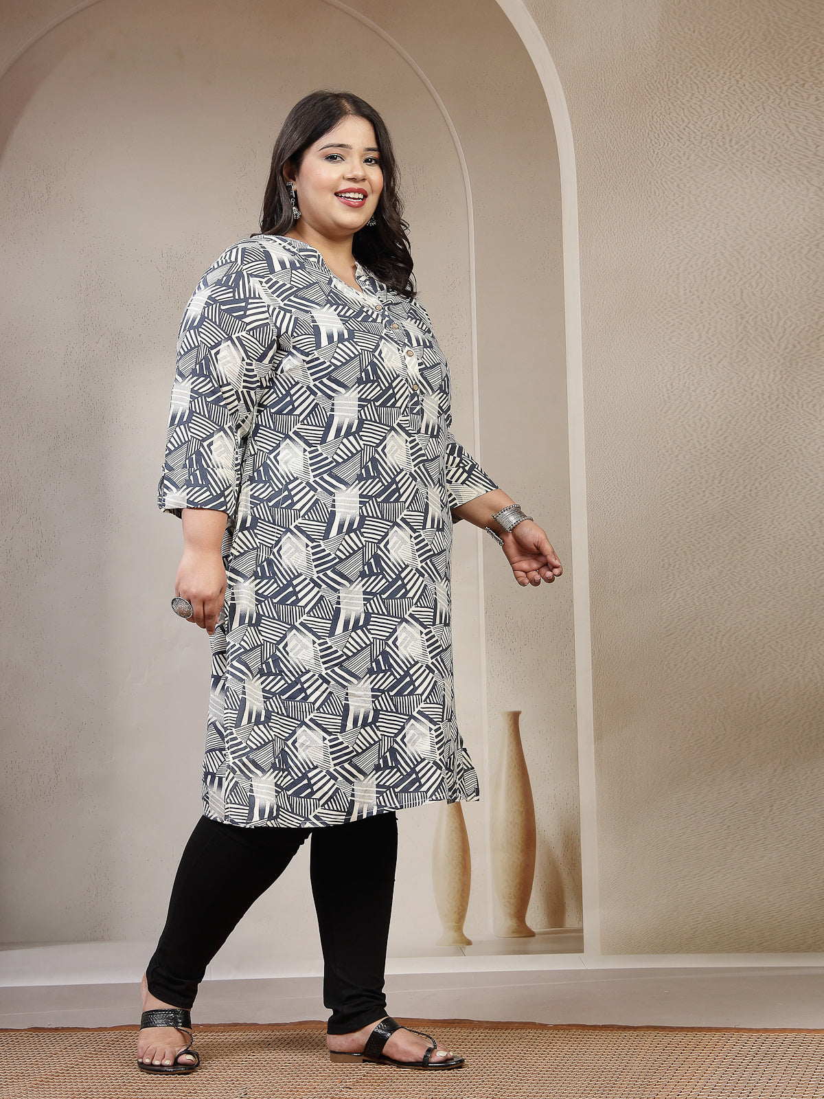 Plus Size Geometric Printed Mandarin Collar Thread Work Straight Kurta