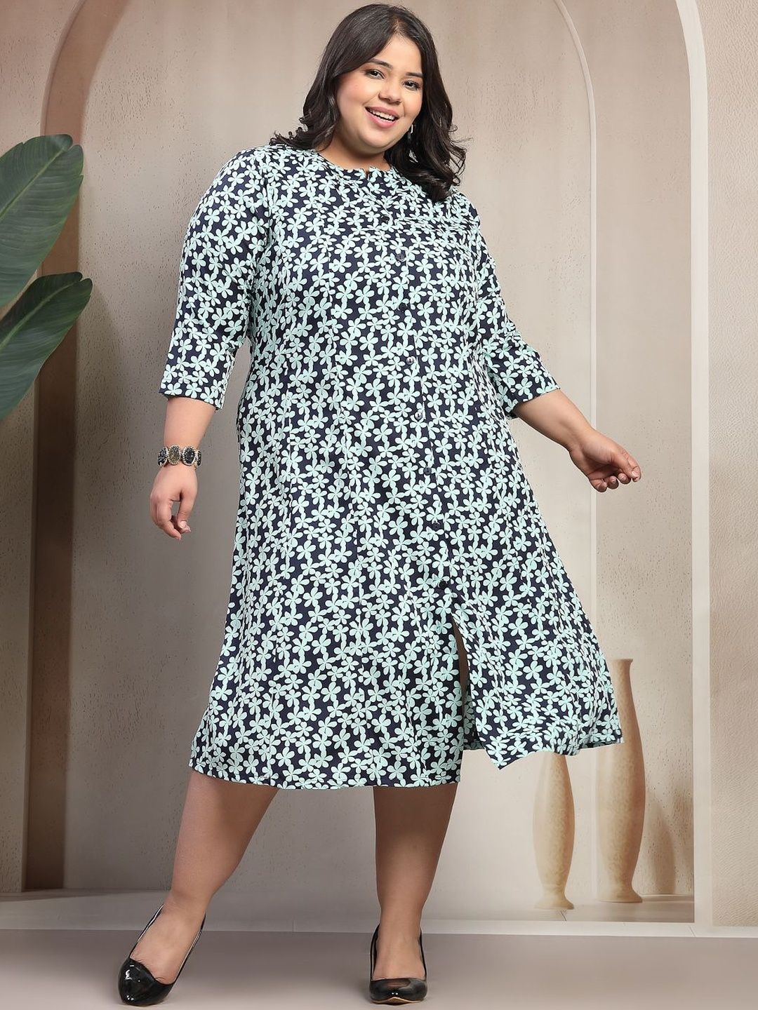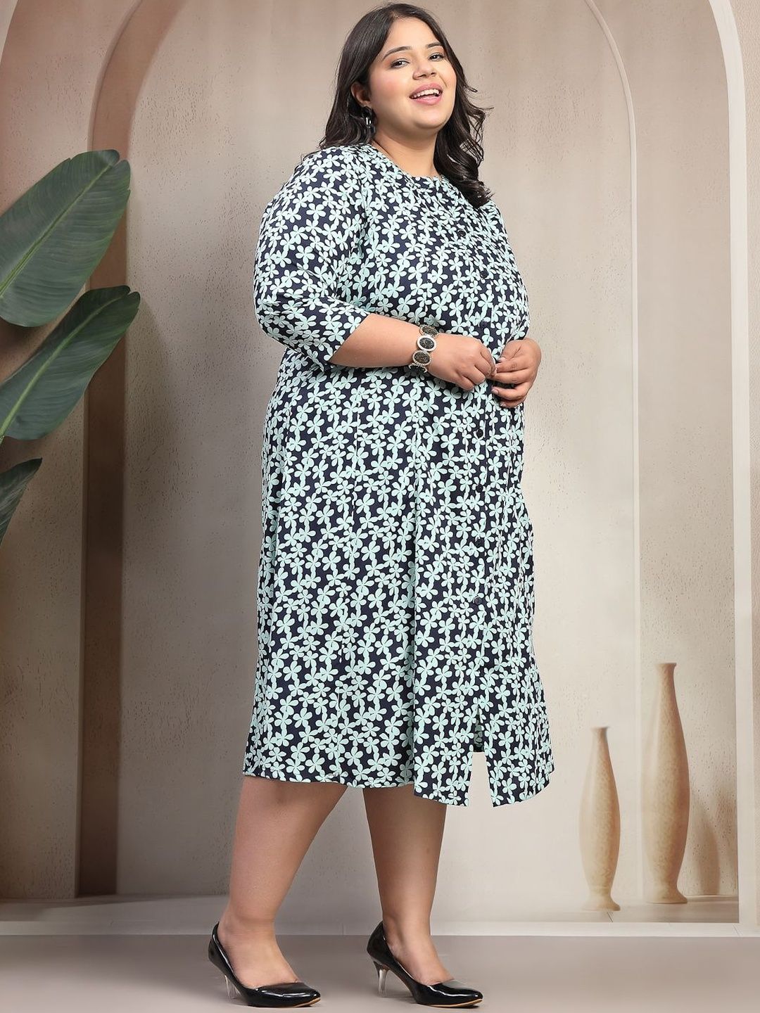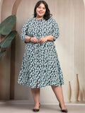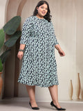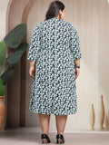 Plus Size Green Floral Printed Short Sleeve Round Neck Midi Dress