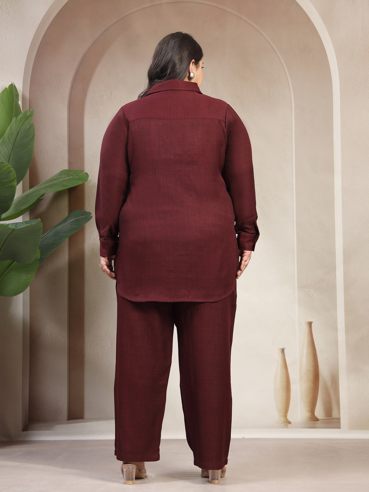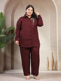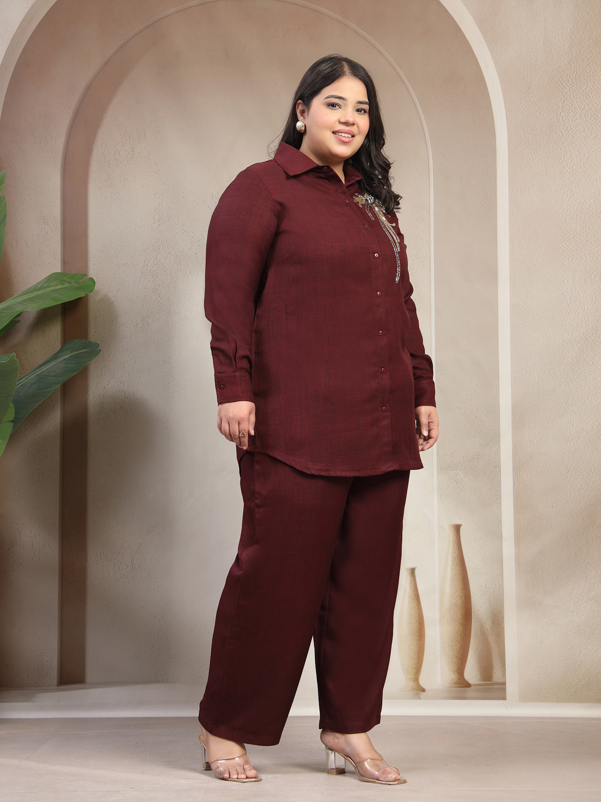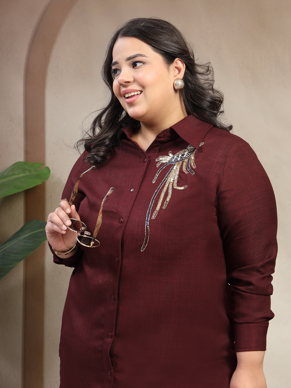 Maroon embellished shirt, has a shirt collar and long sleeves, secured with Button closure