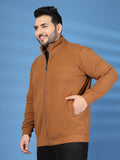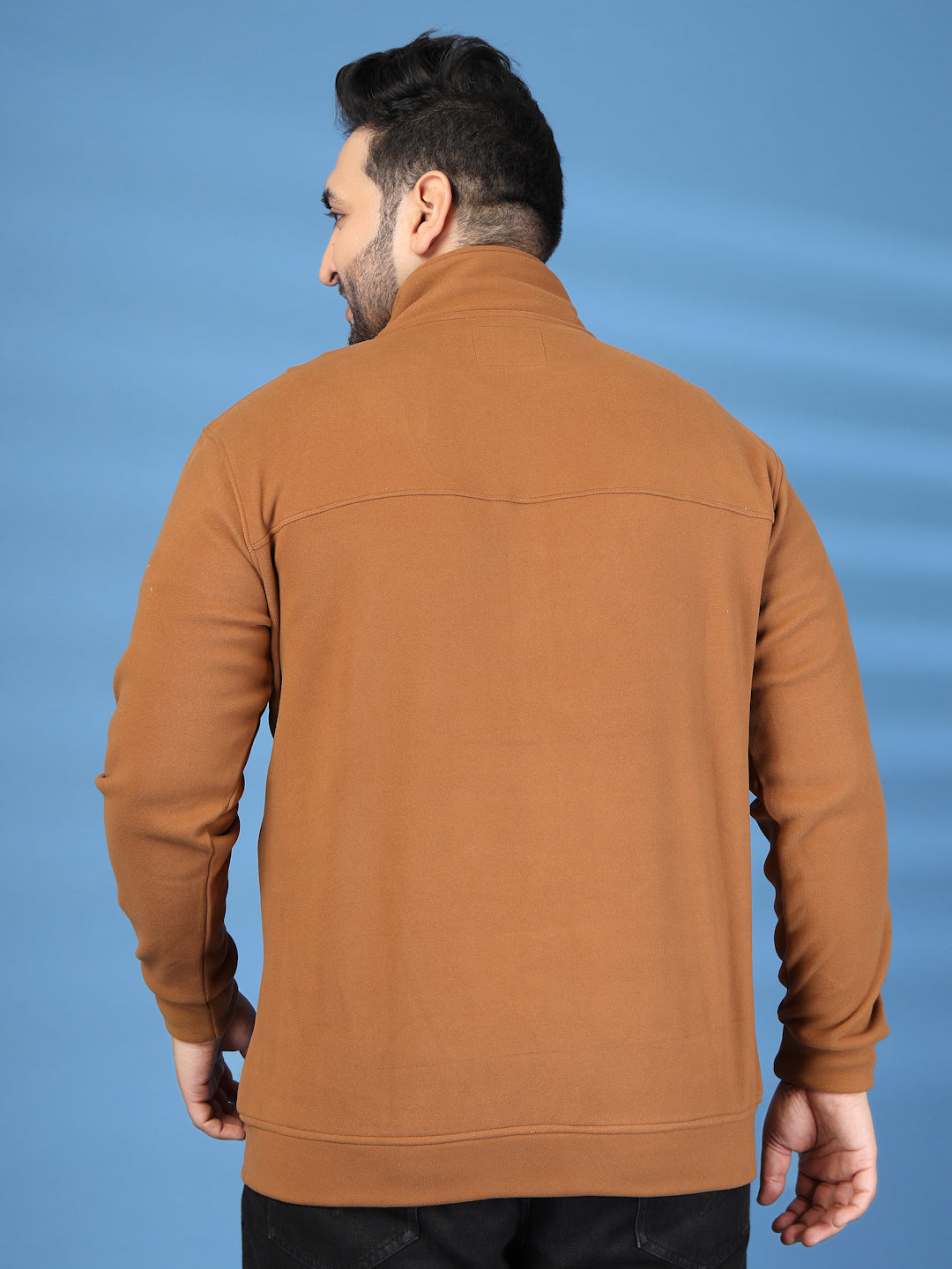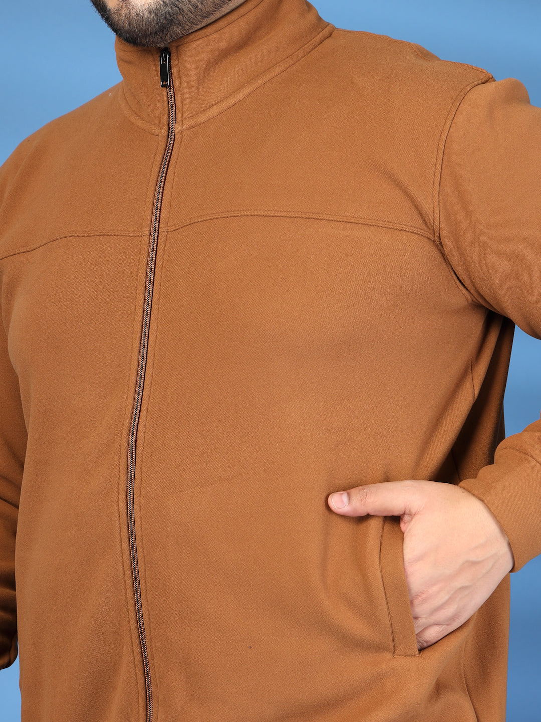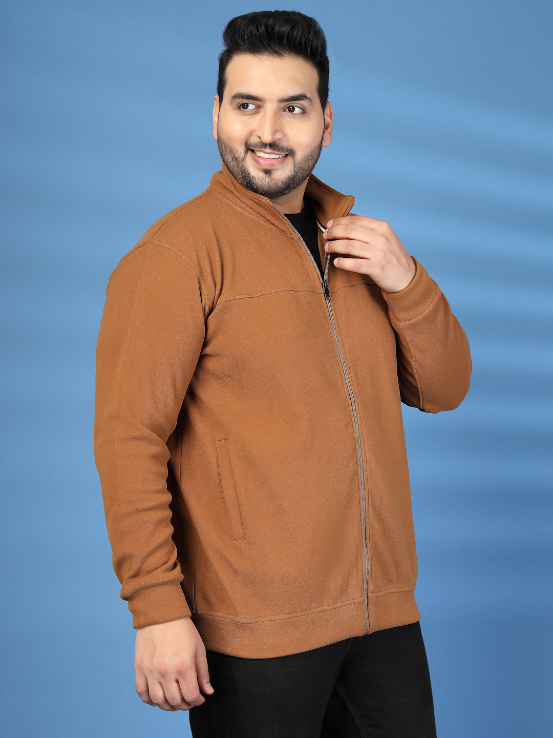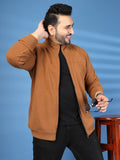 Brown solid bomber with zip detail, has a mandarin collar, pockets ,has a button closure, long sleeves, straight hemline, polyester lining