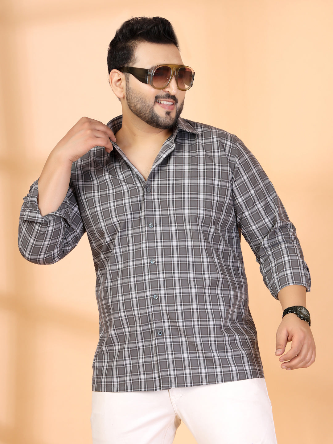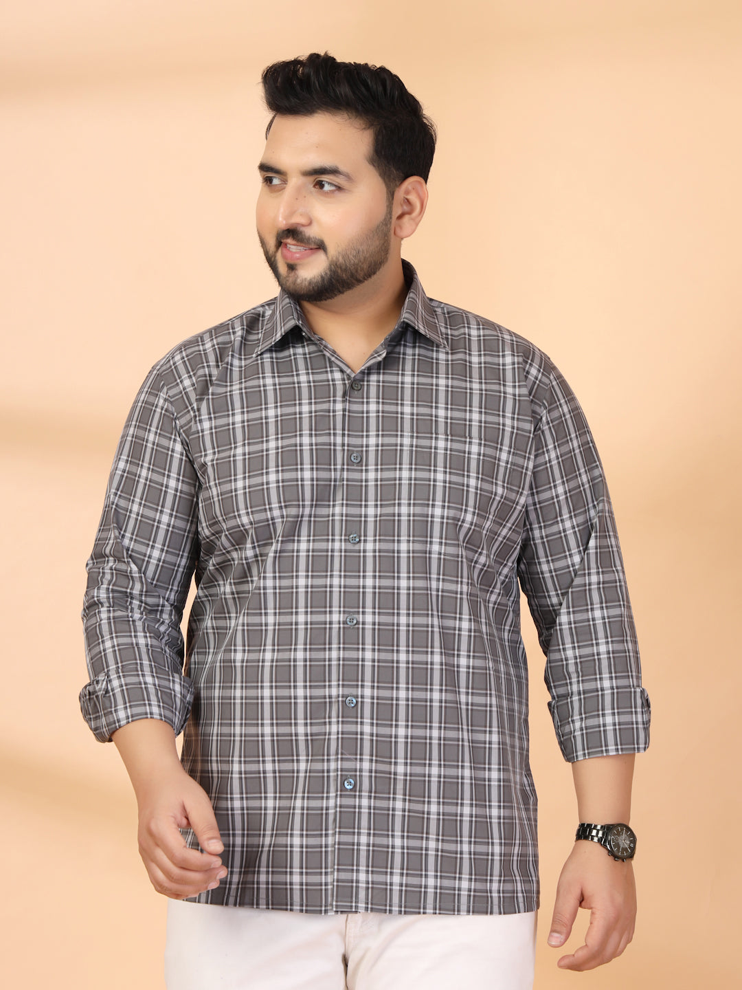 Grey other checks checked opaque Casual shirt ,has a spread collar, button placket, 1 patch pocket, long roll-up sleeves, curved hem