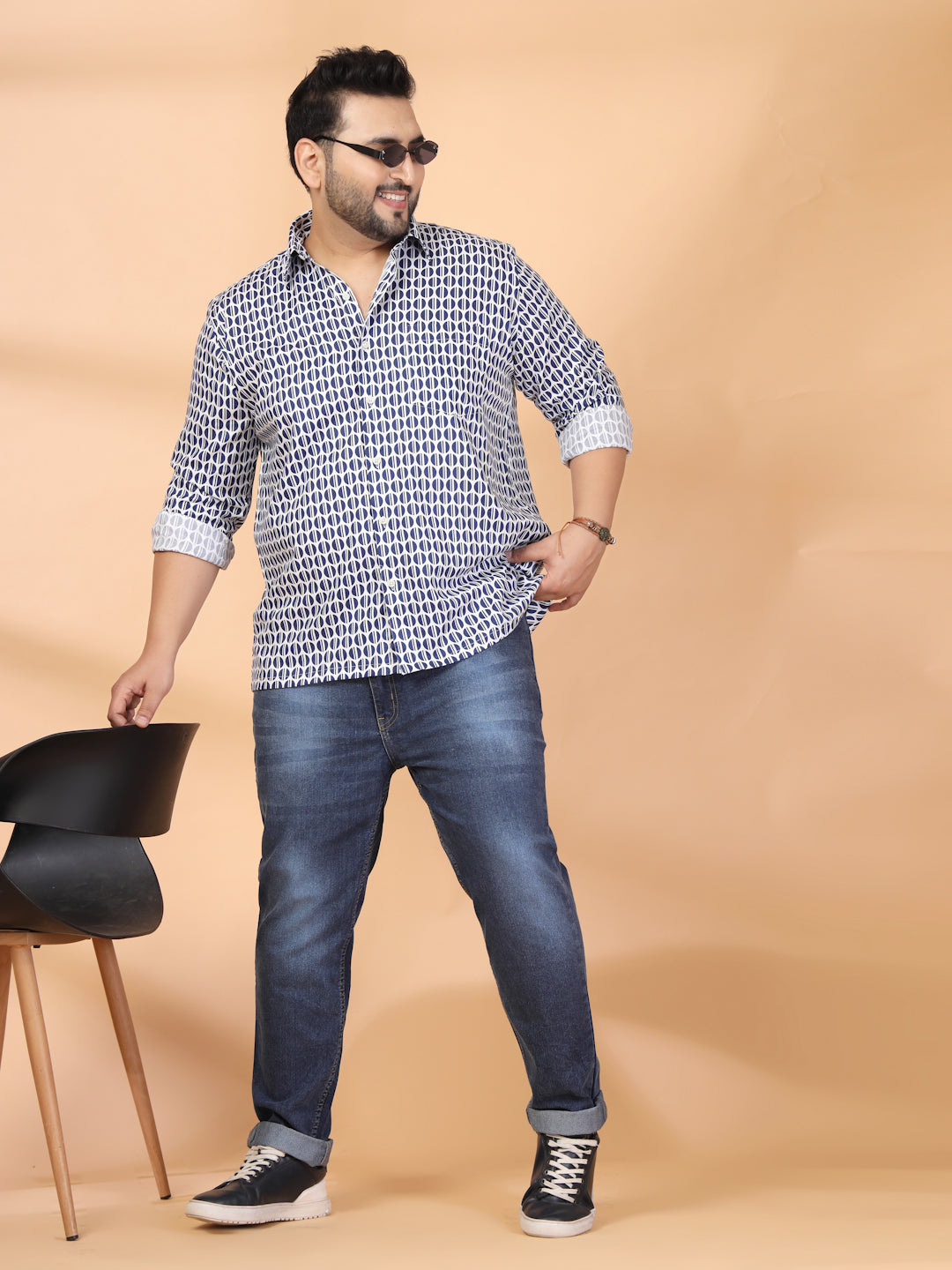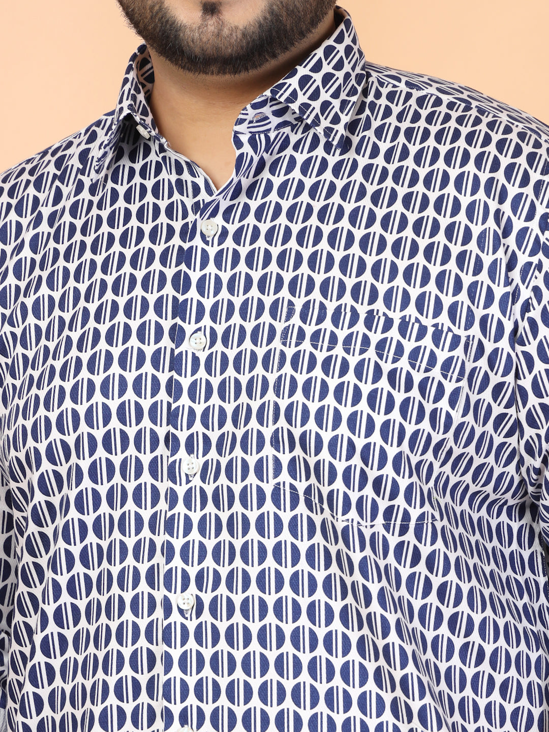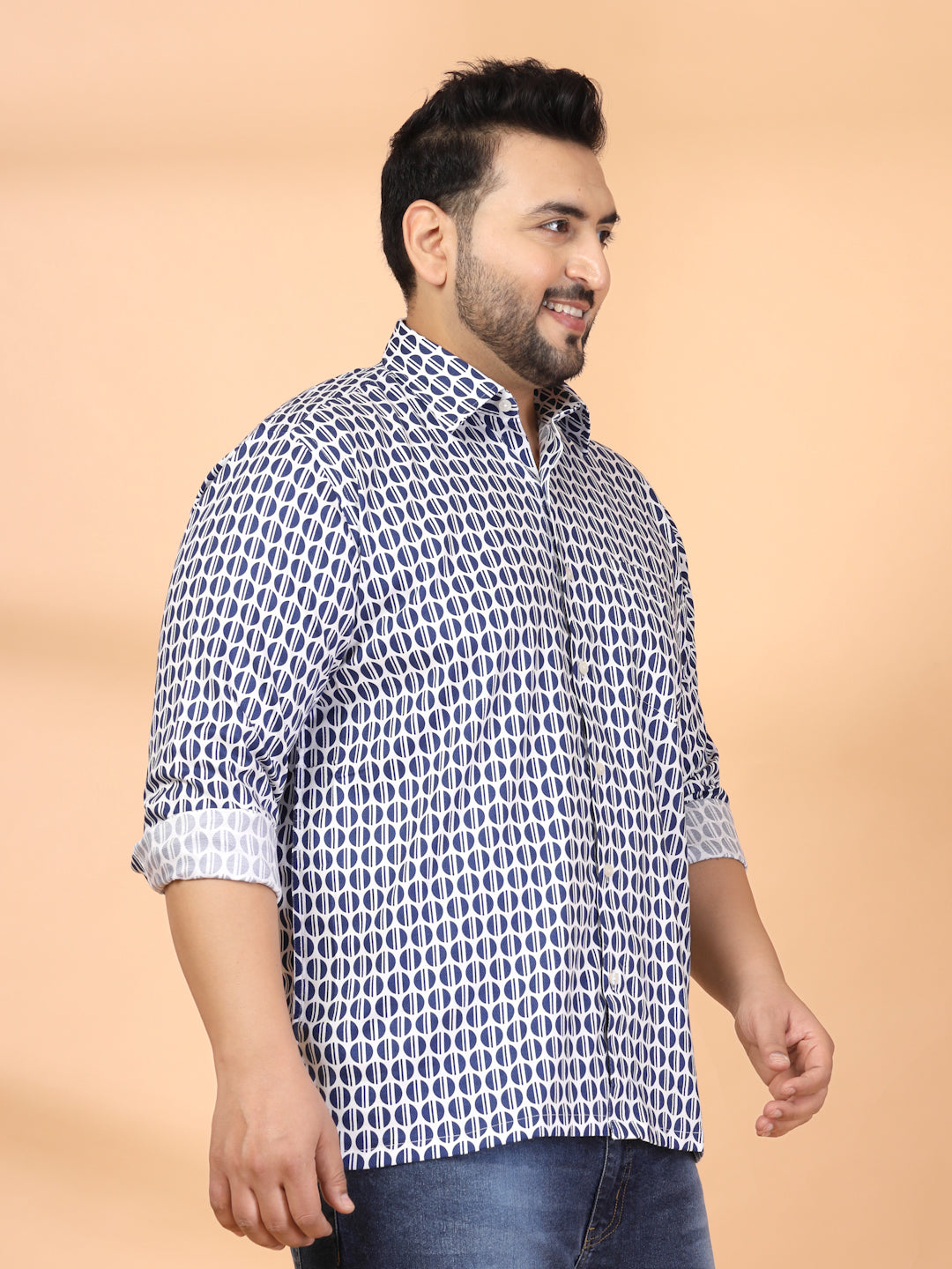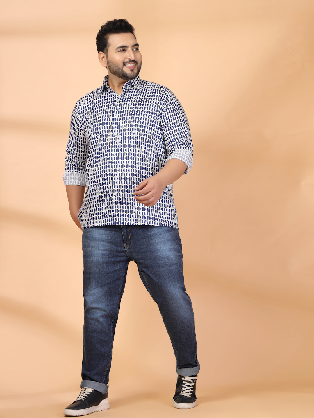 Navy blue geometric printed opaque Casual shirt ,has a spread collar, button placket, 1 patch pocket, long roll-up sleeves, curved hem