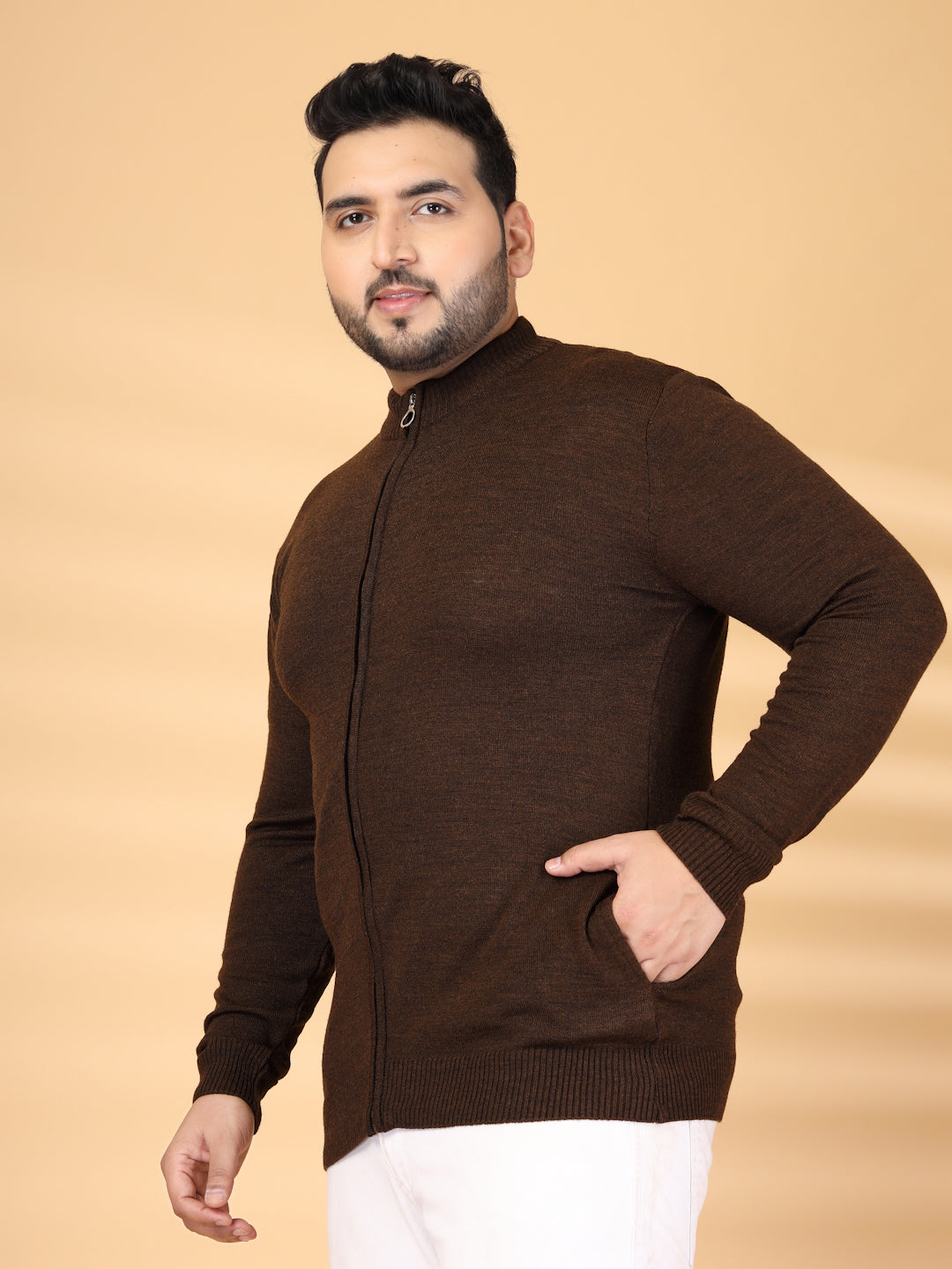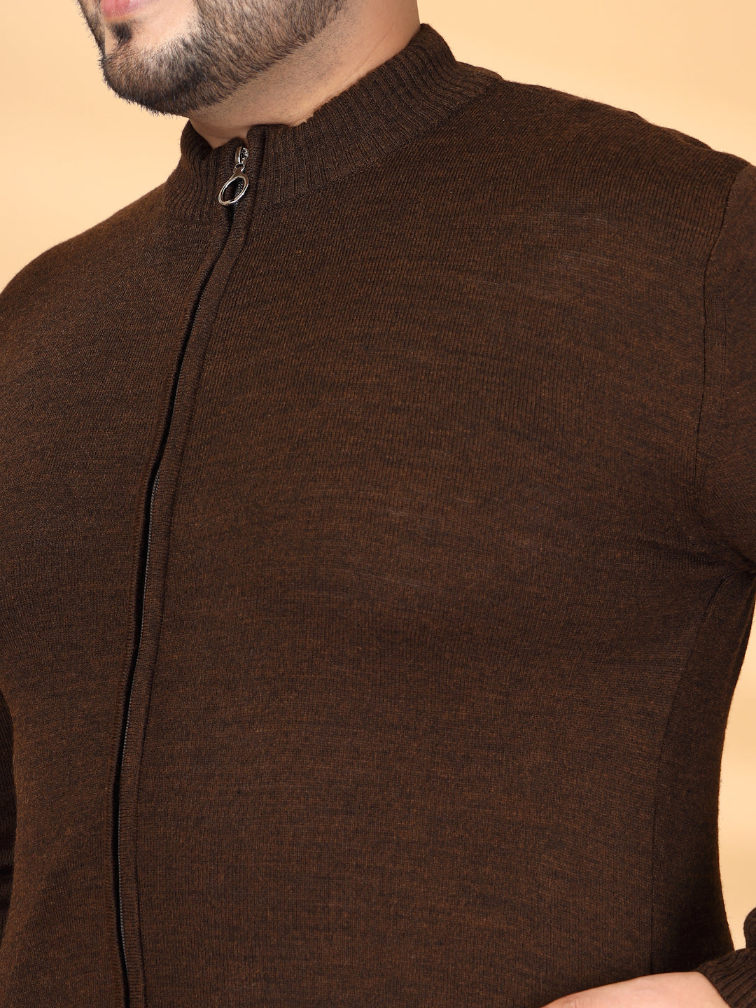 Brown solid zip detail front-open ,has a round neck, 2 pockets, long sleeves, zip closure, ribbed hem