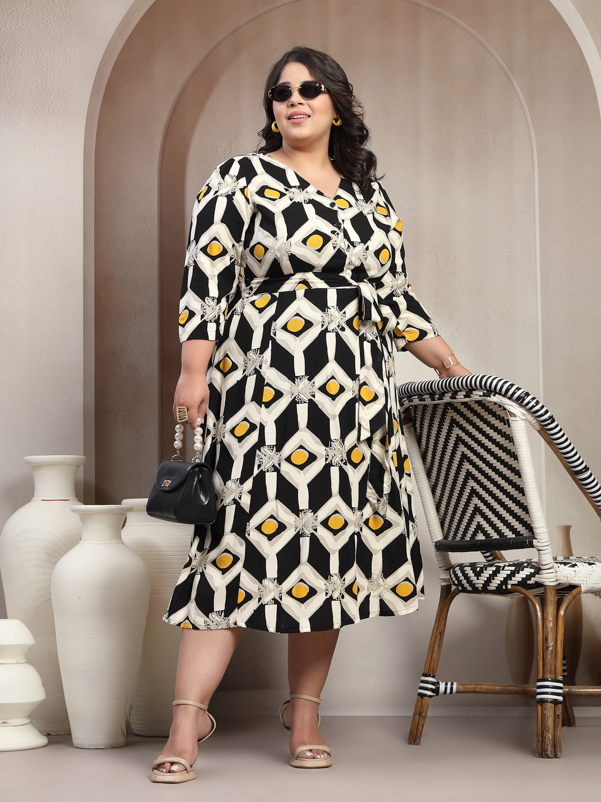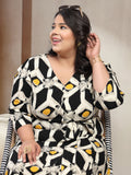 - Black geometric print fit and flared dress