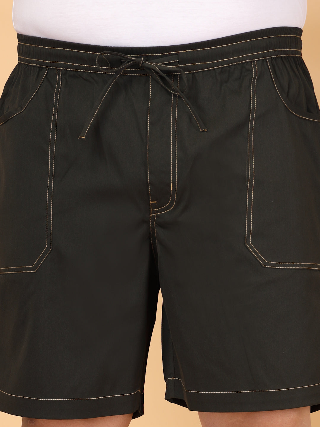 Black solid mid-rise regular shorts, has 3 pockets, drawstring closure