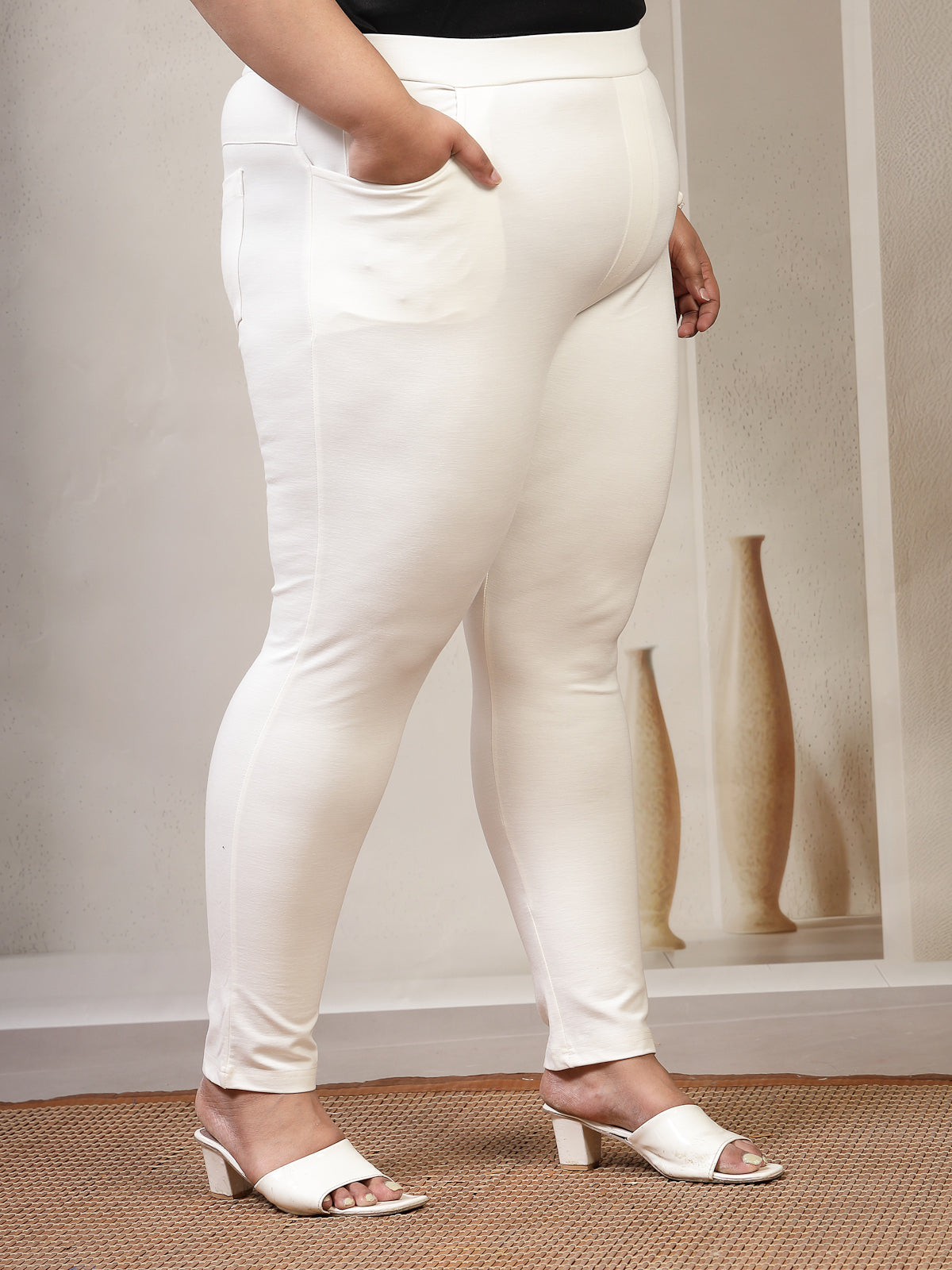 White solid jeggings has a slip-on closure and 5 pocket
