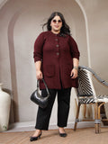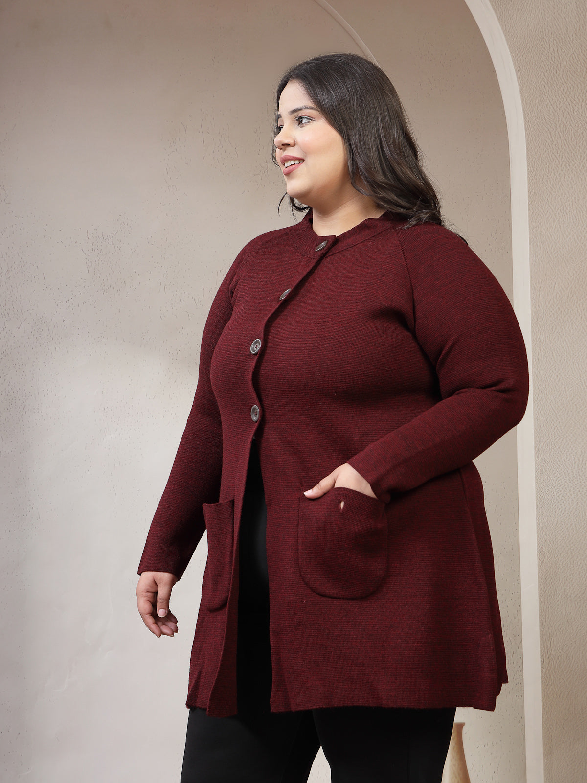 Maroon solid cardigan ,has a round neck, long sleeves, button closure, straight hem