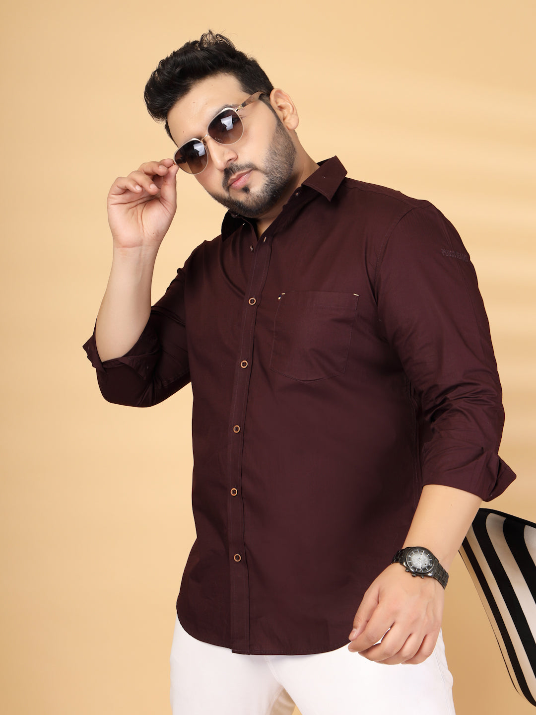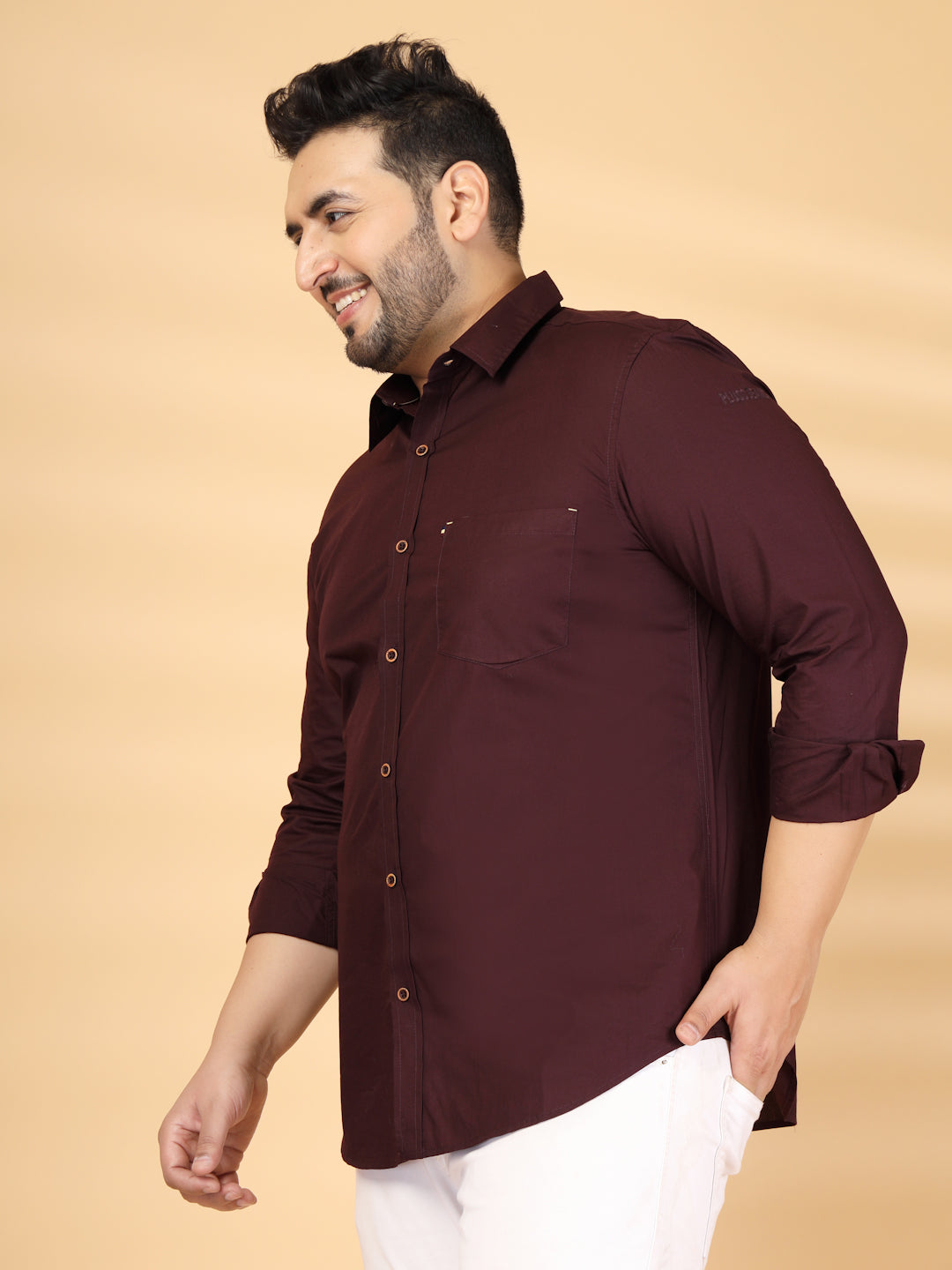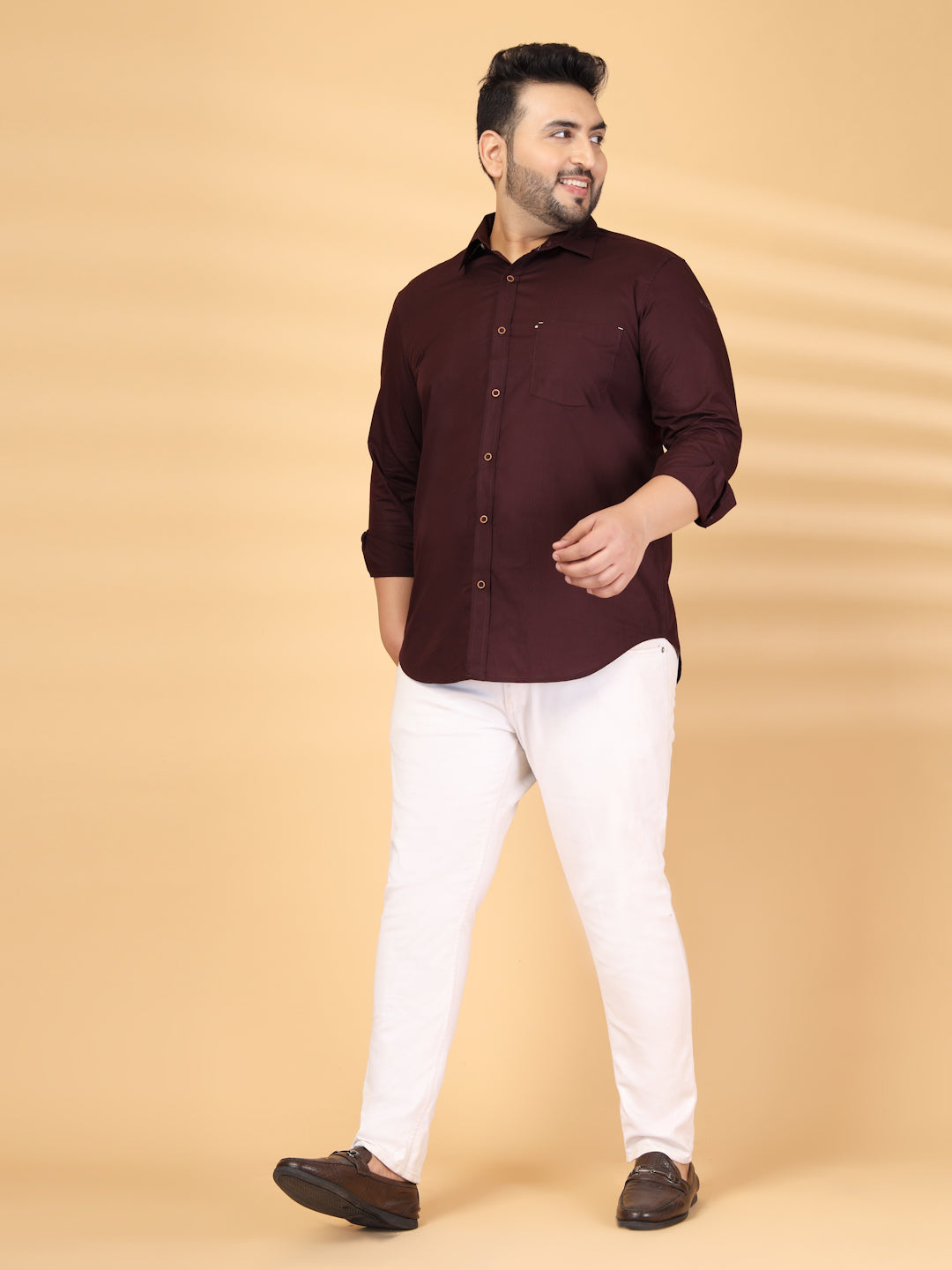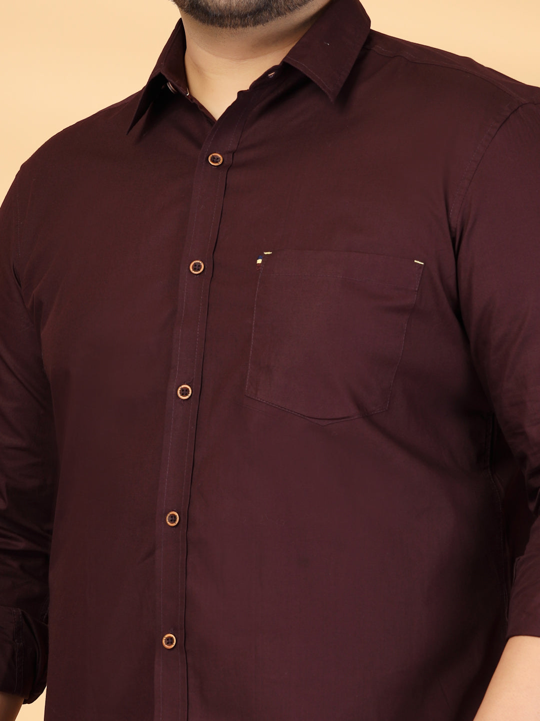 Brown solid opaque casual shirt ,has a spread collar, button placket, 1 patch pocket, long regular sleeves, curved hem