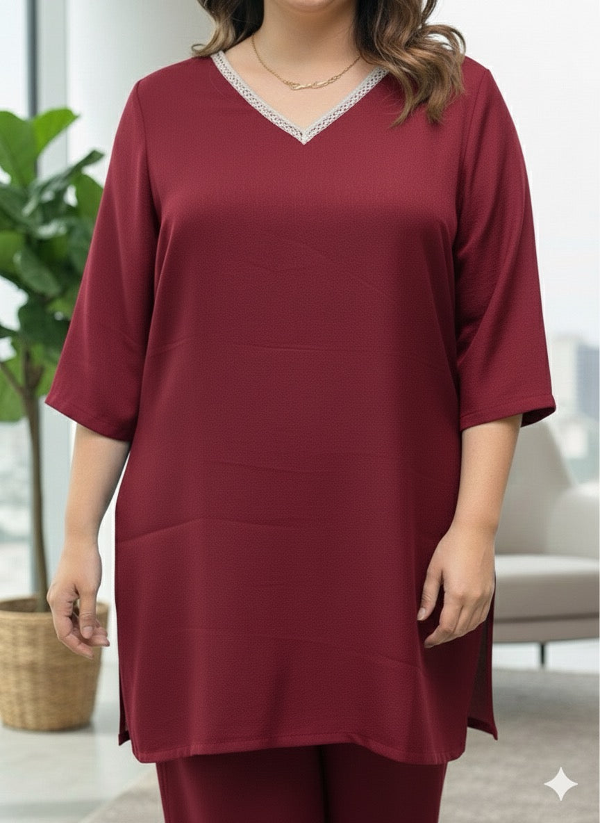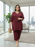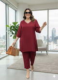 Plus Size Wine Relaxed Fit Solid Tunic And Trousers