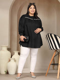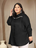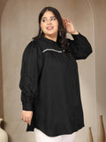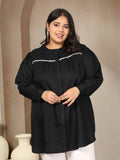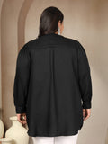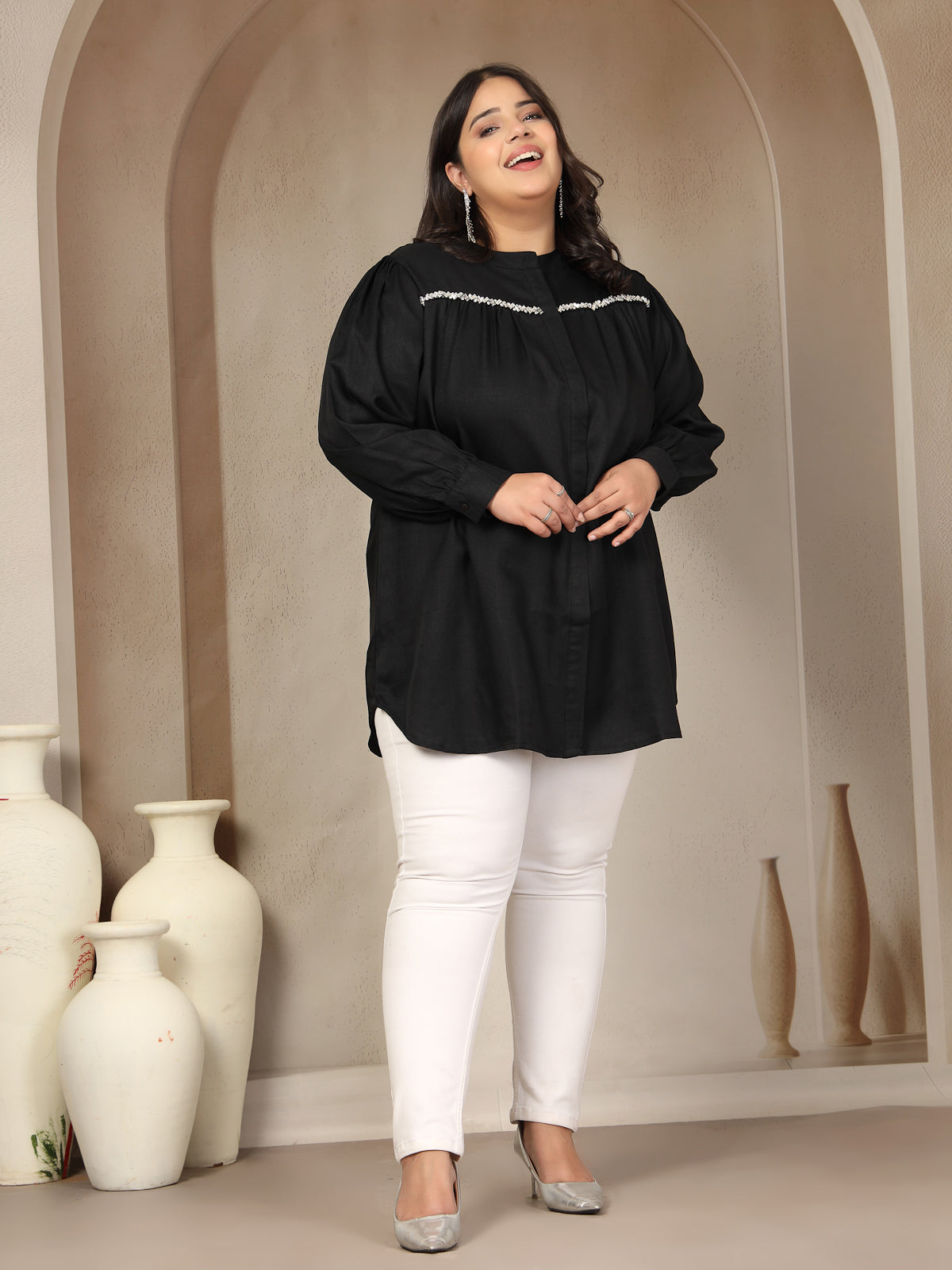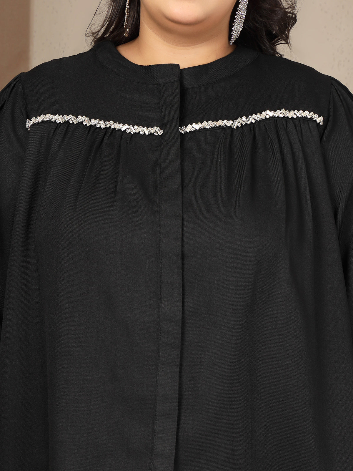 Black solid opaque Casual shirt ,has a band collar, button placket, long puff sleeves, high-low hem
