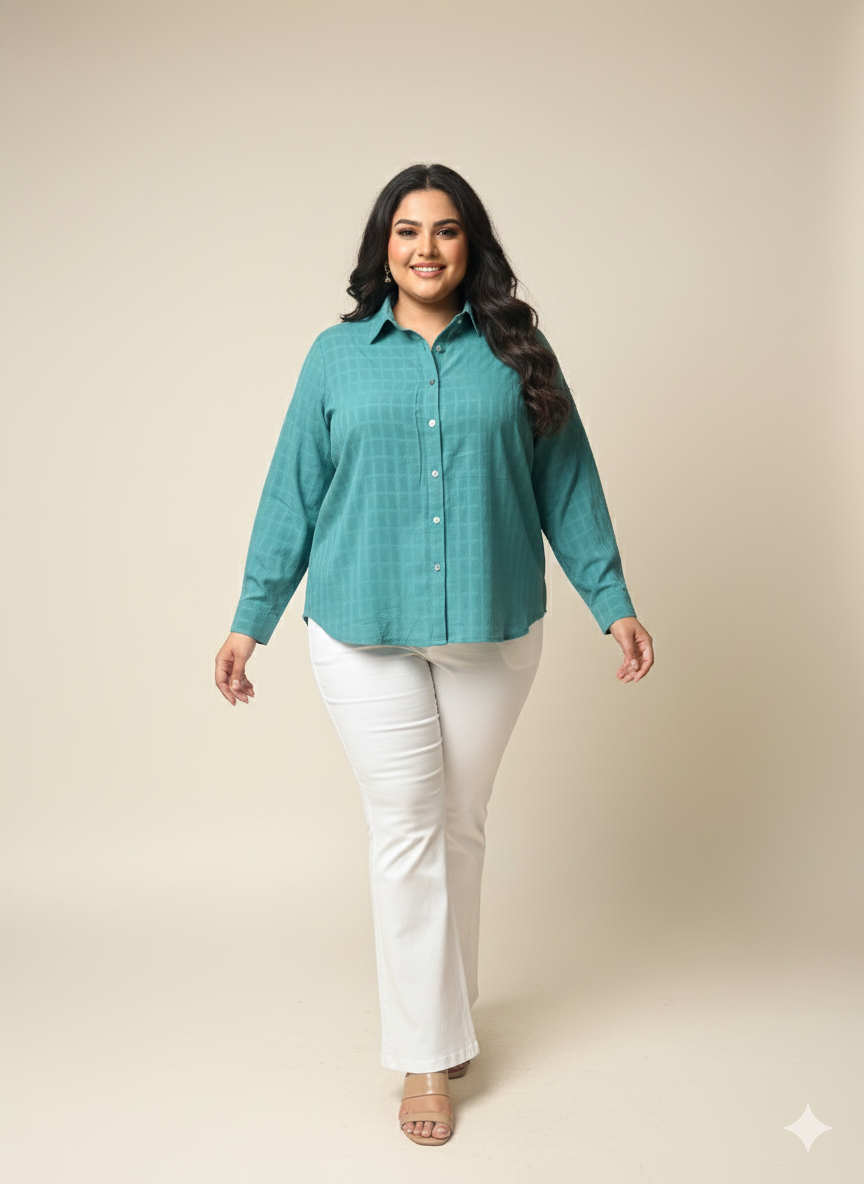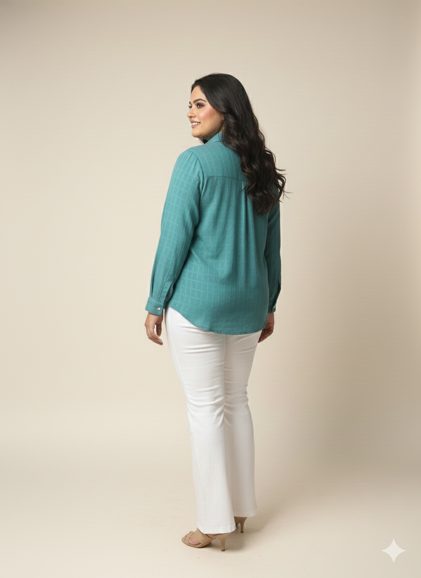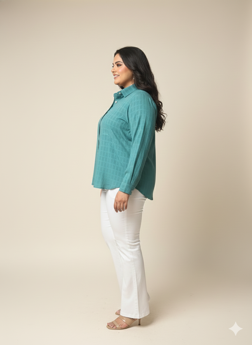 Green textured opaque Casual shirt ,has a spread collar, button placket, long regular sleeves, curved hem