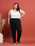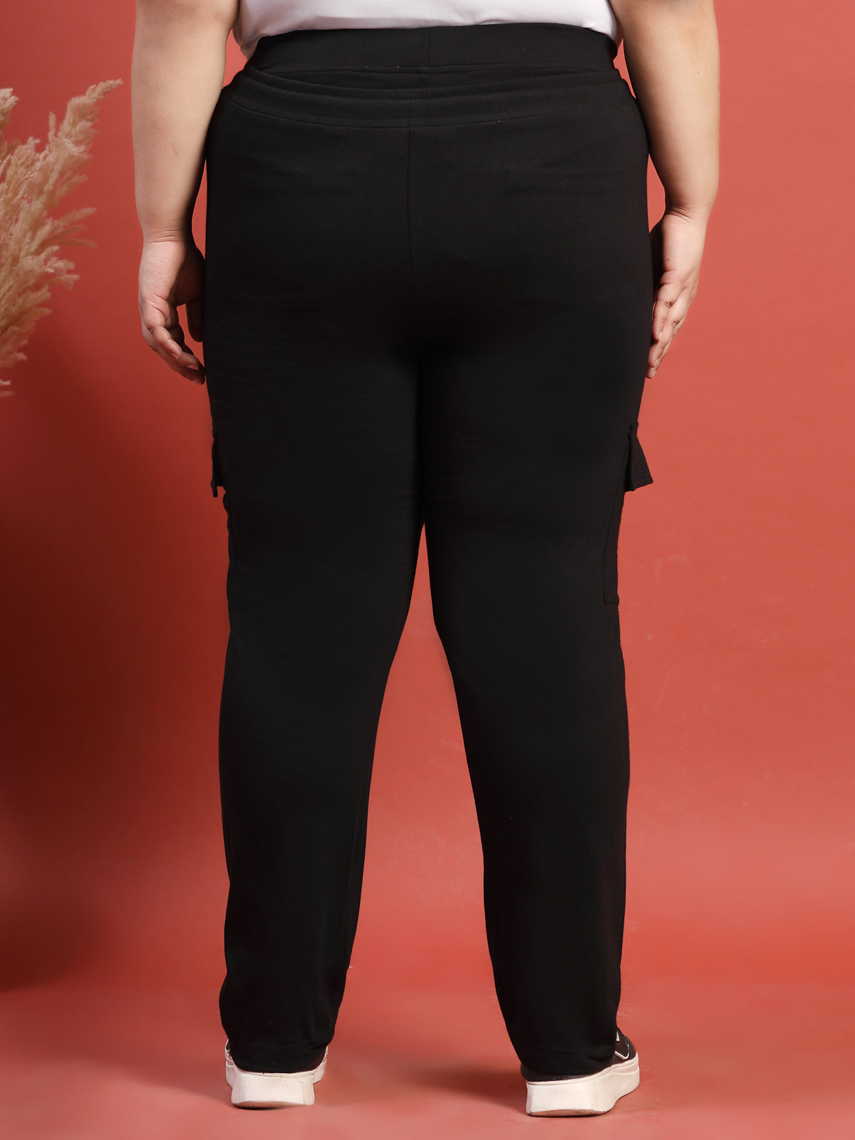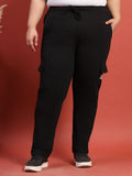 Black solid regular-fit mid-rise cargo track pant with print detail, has an elasticated waistband with drawstring closure and 4 pockets
