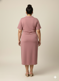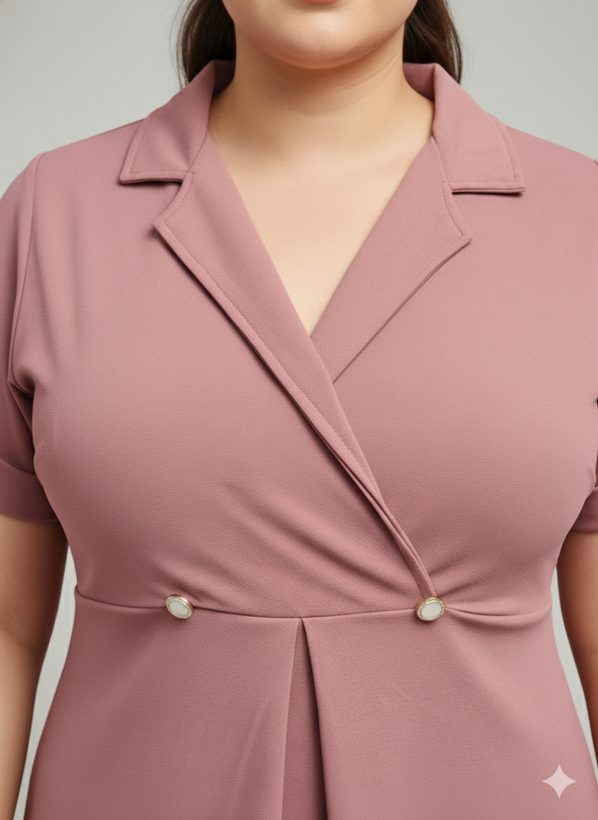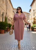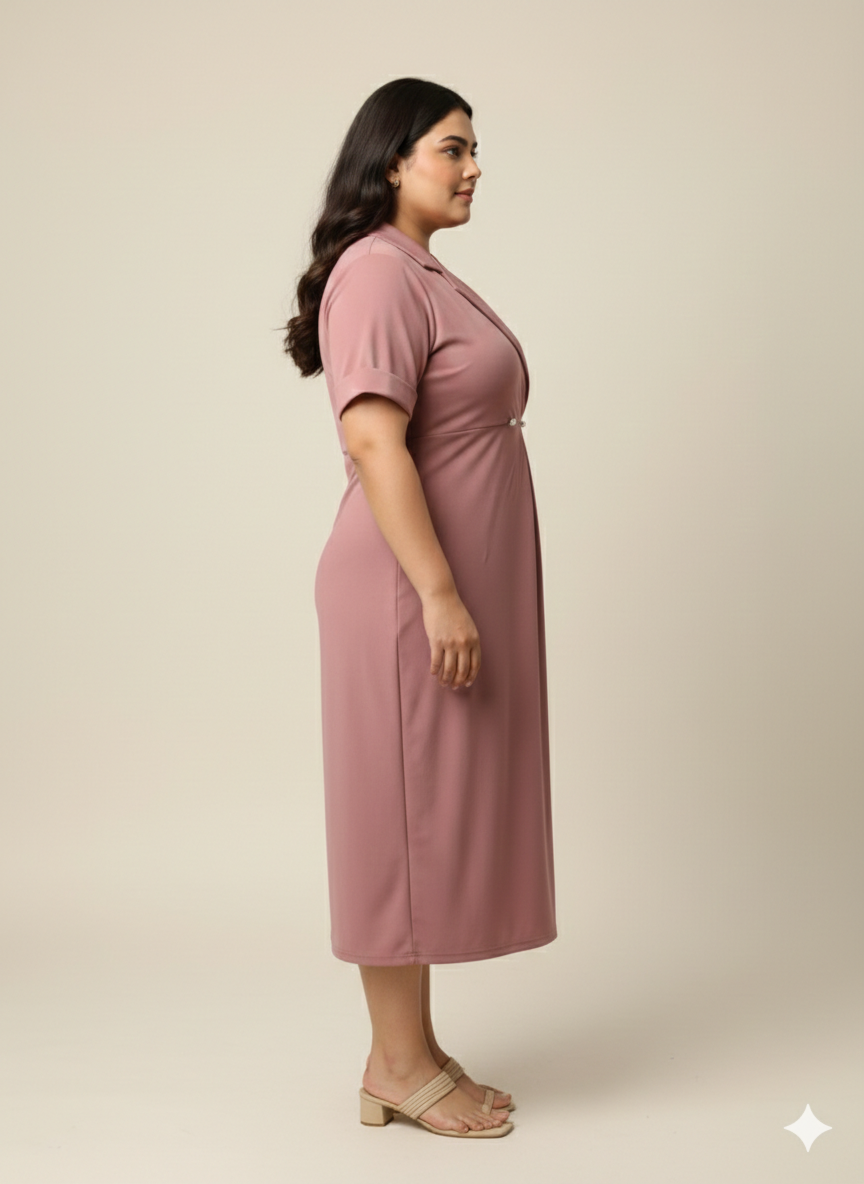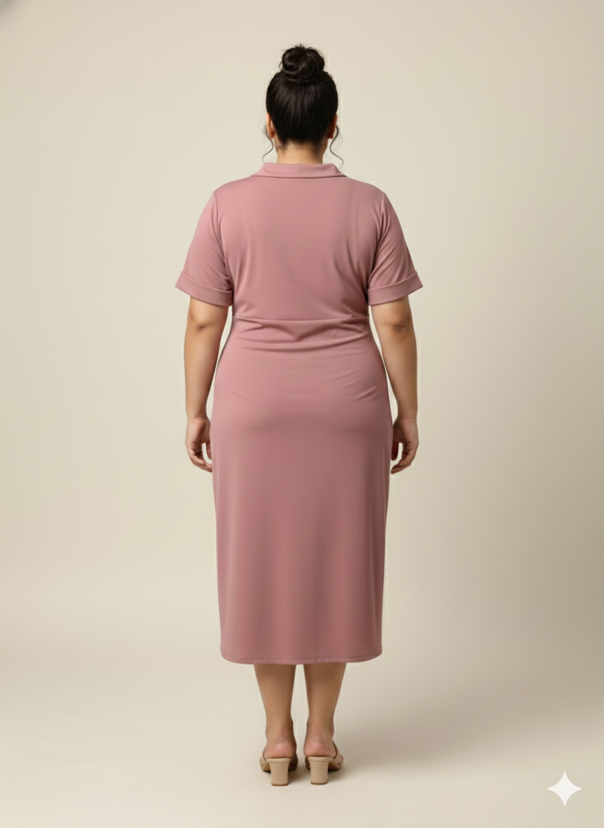 Pink Notch Collar Button Midi Dress, in Canton fabric, Unlined, Midi Length, Comfort Fit, Button Closure, Flared Hemline and features Button Detail