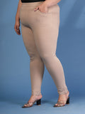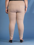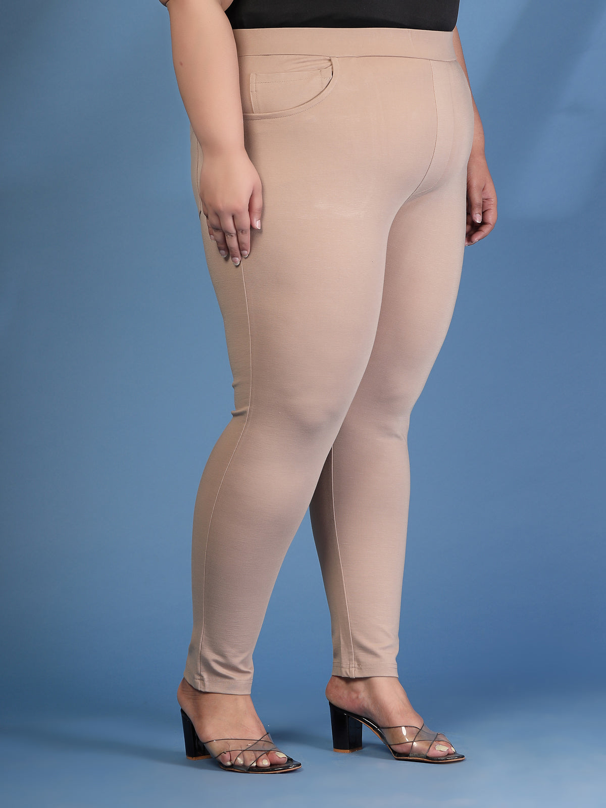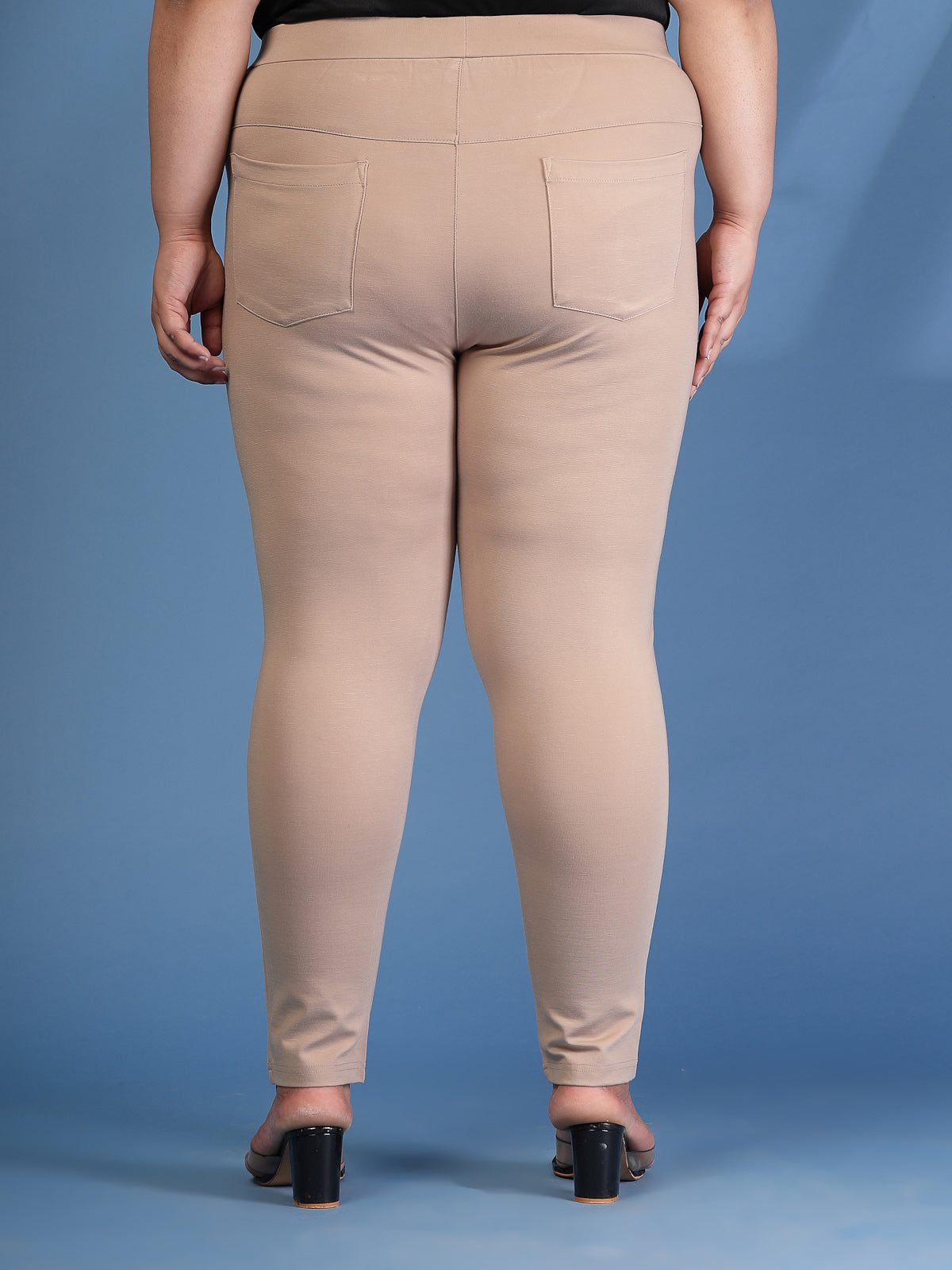 Beige solid jeggings has a slip-on closure and 5 pocket