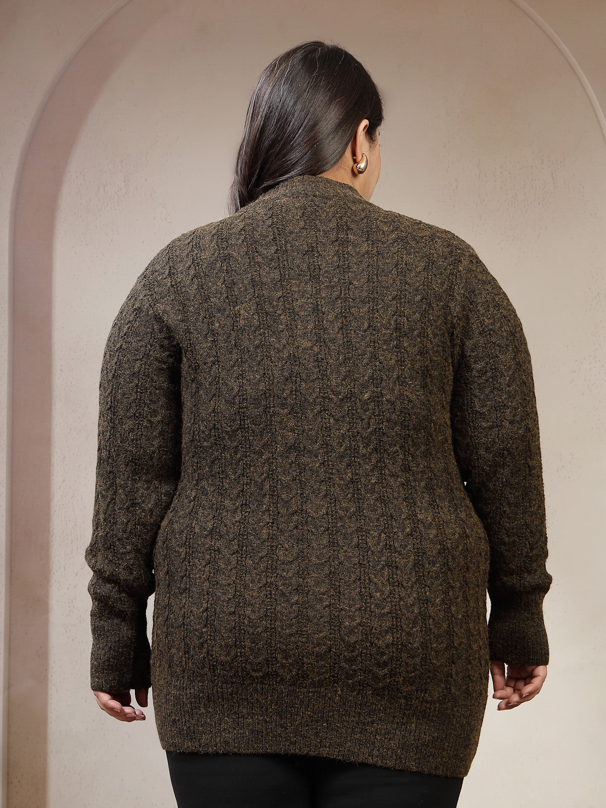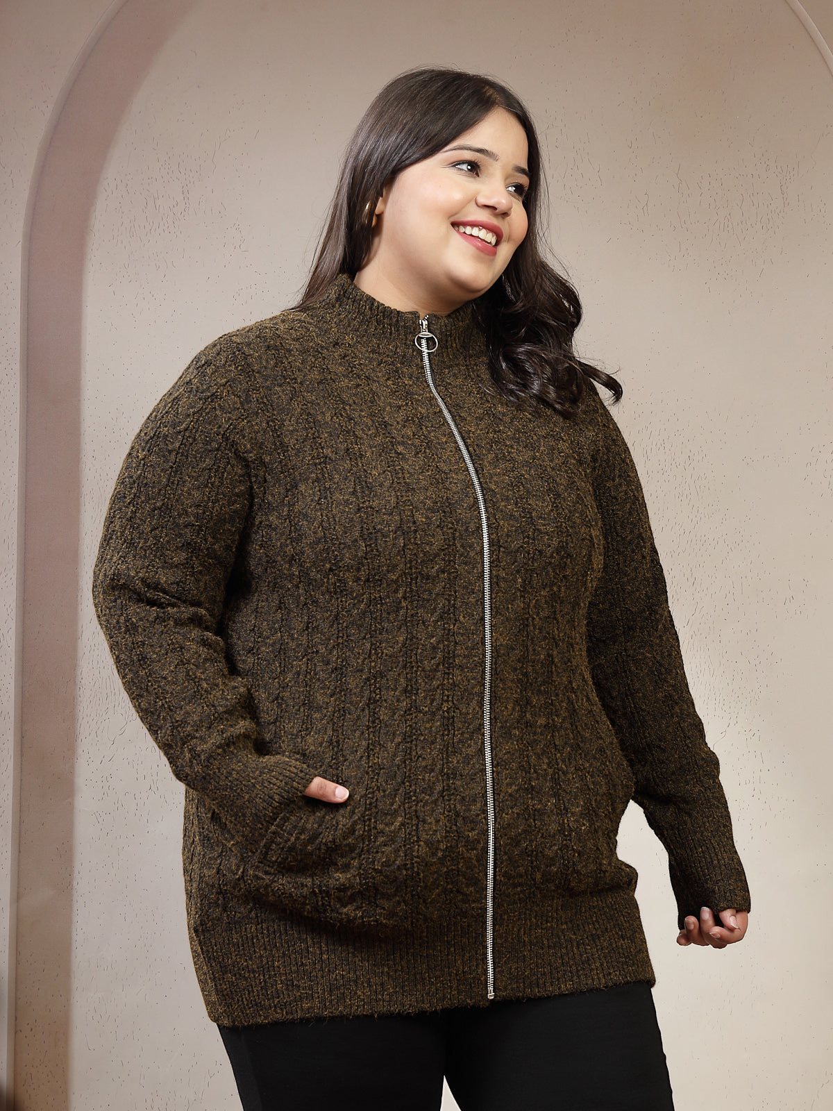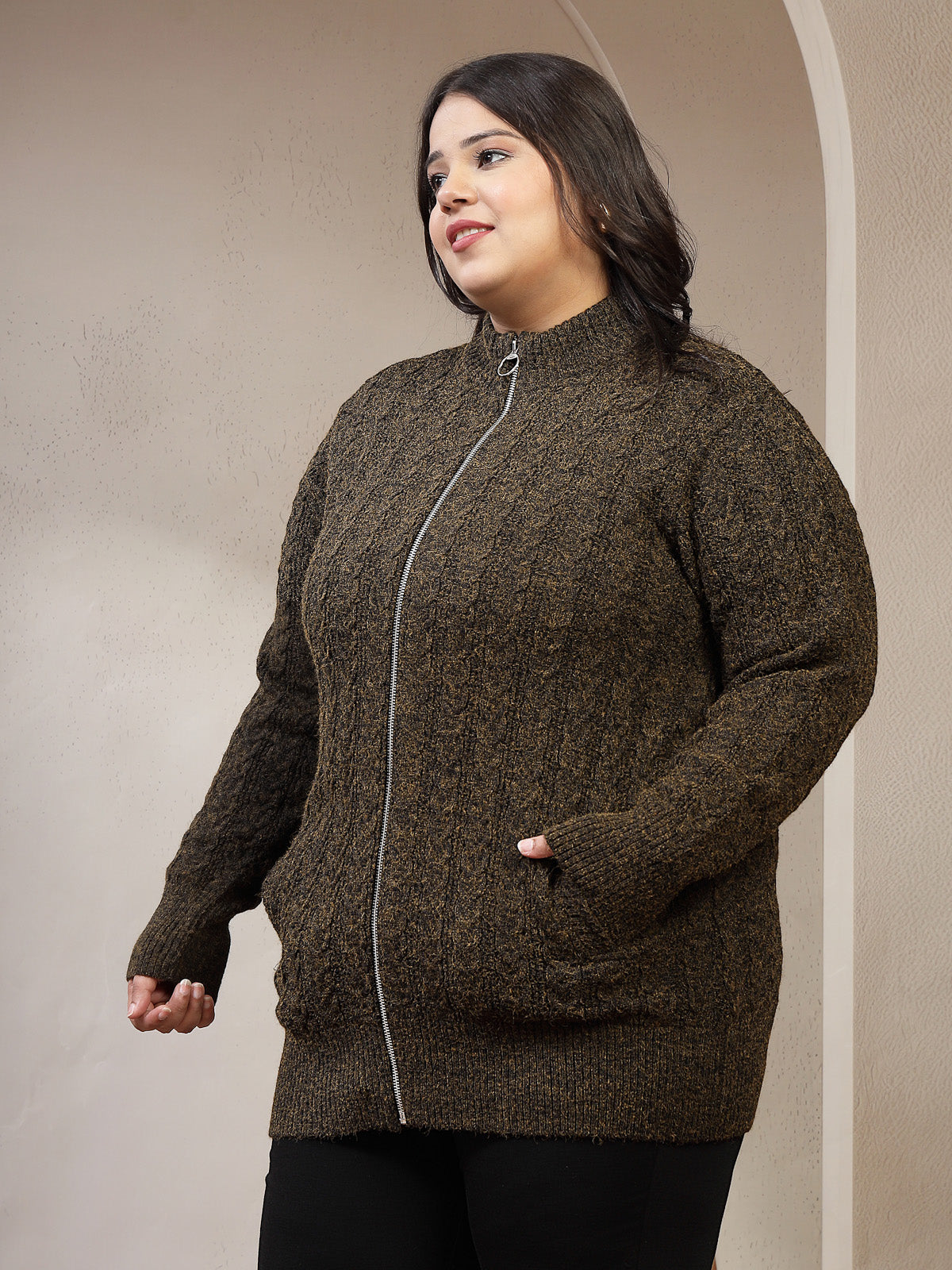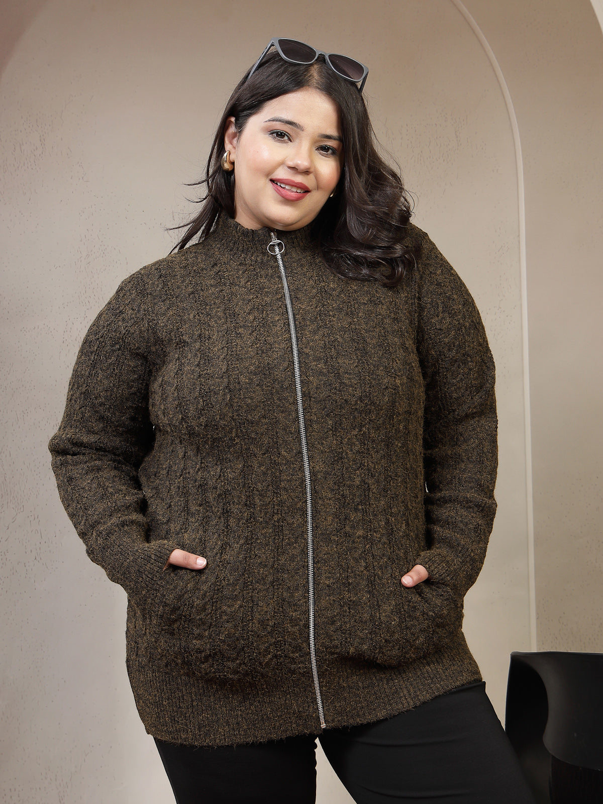 Brown solid front-open ,has a high neck, 2 insert pockets, long sleeves, zip closure, ribbed hem