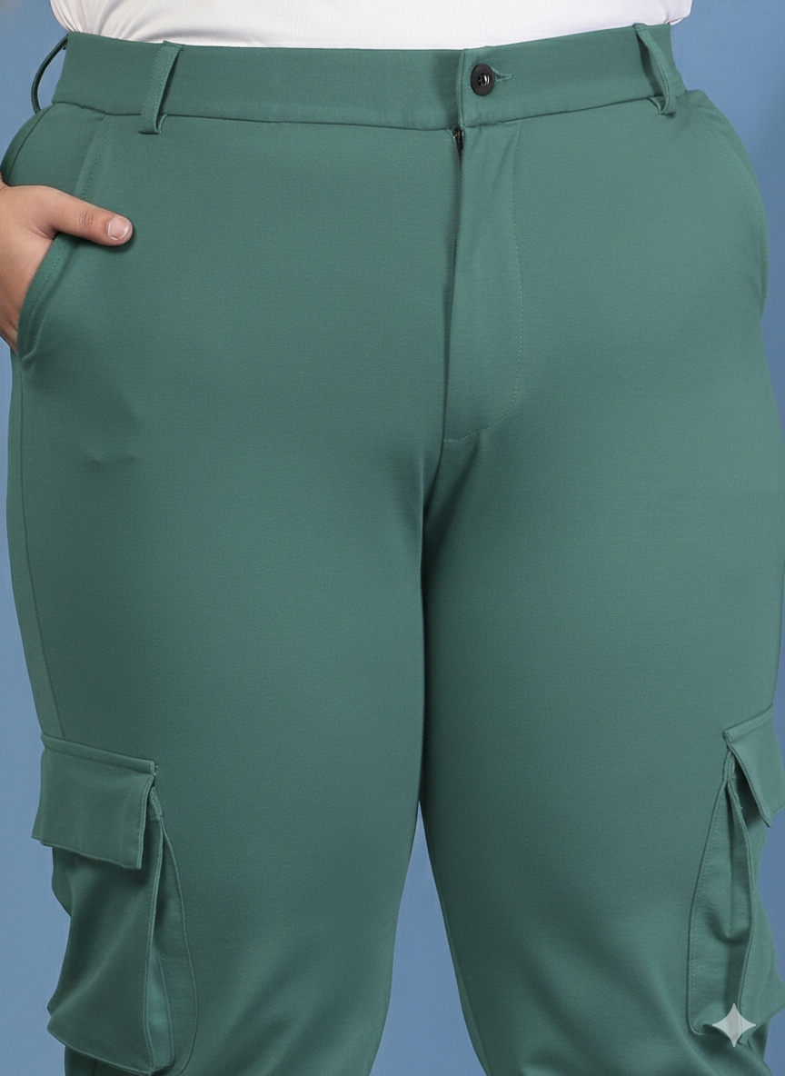 Green solid mid-rise Cargo trousers, has a Button & Zip Closure