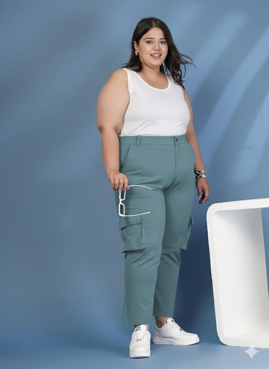 Plus Size Women Solid Mid Rise Regular Fit Cargo Trousers