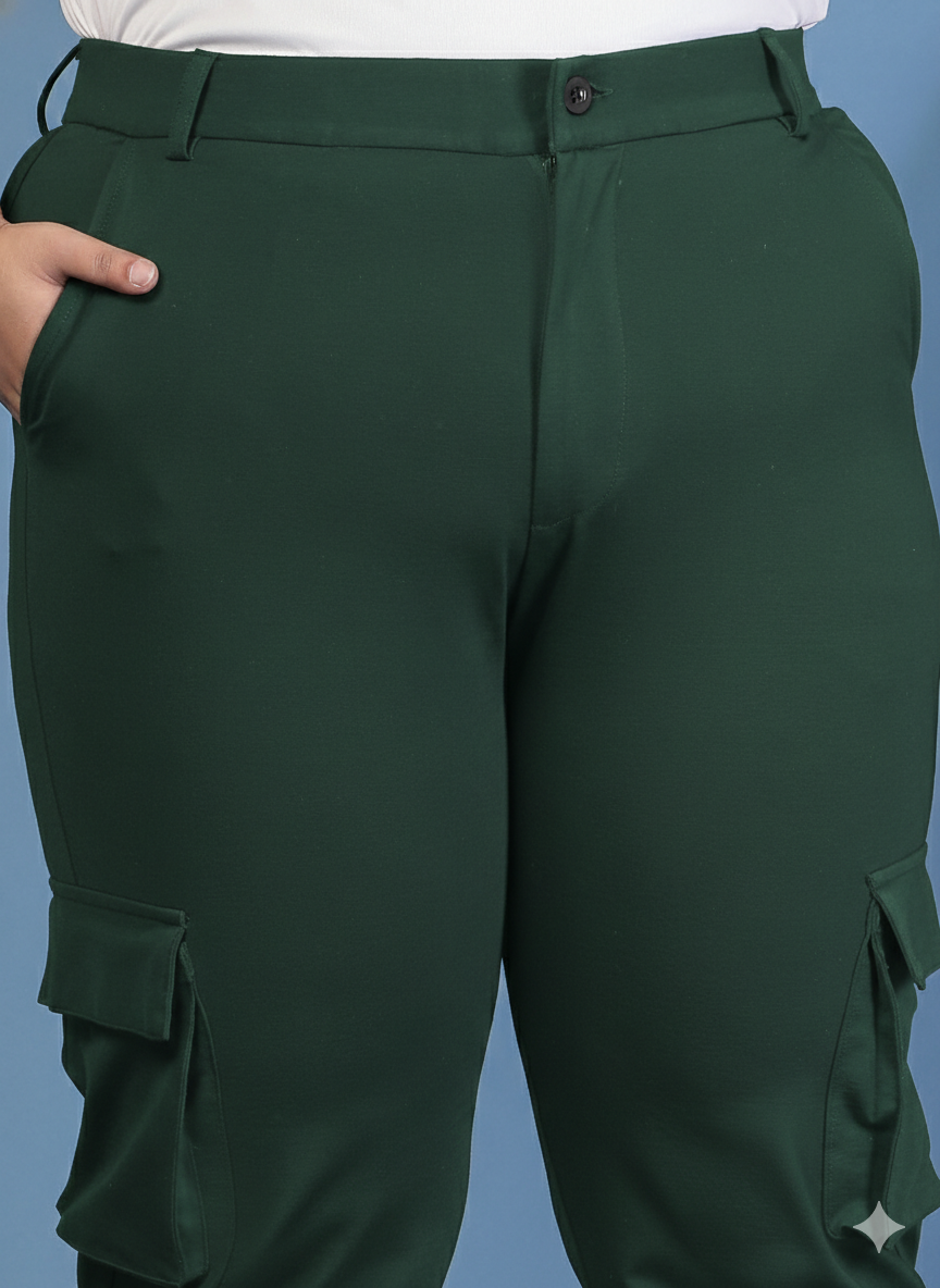 Dark Green solid mid-rise Cargo trousers, has a Button & Zip Closure