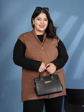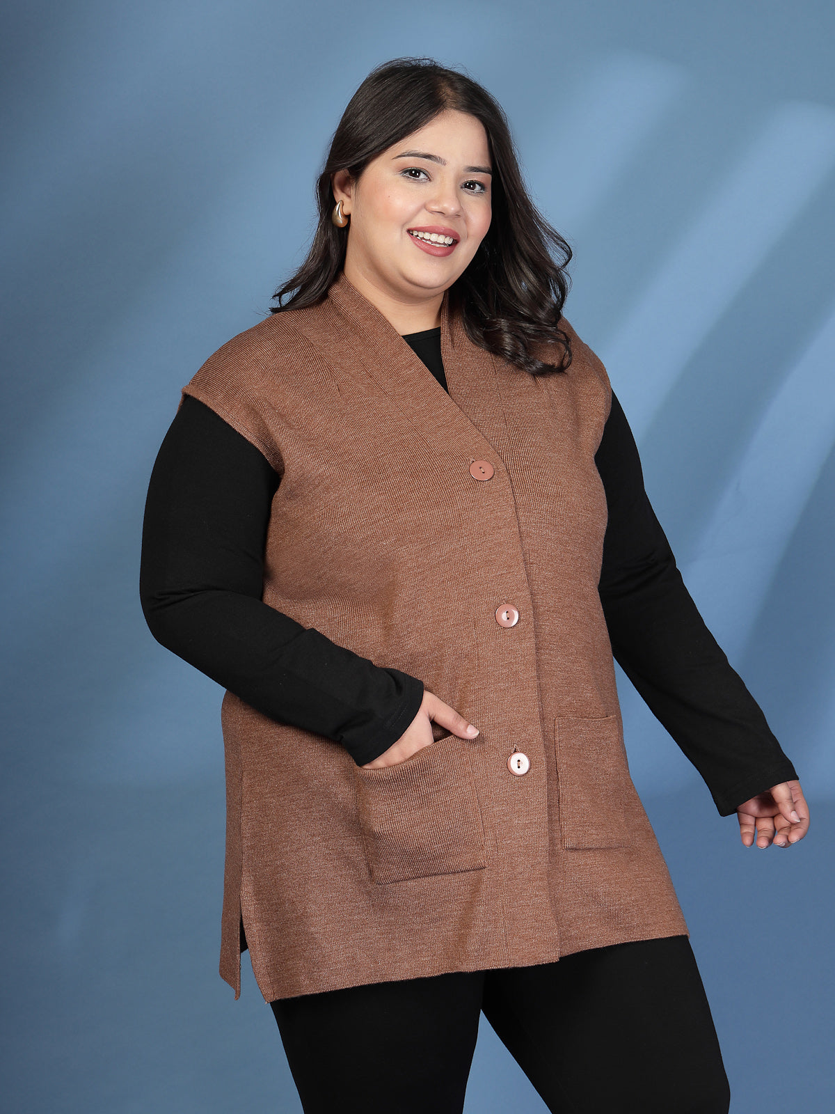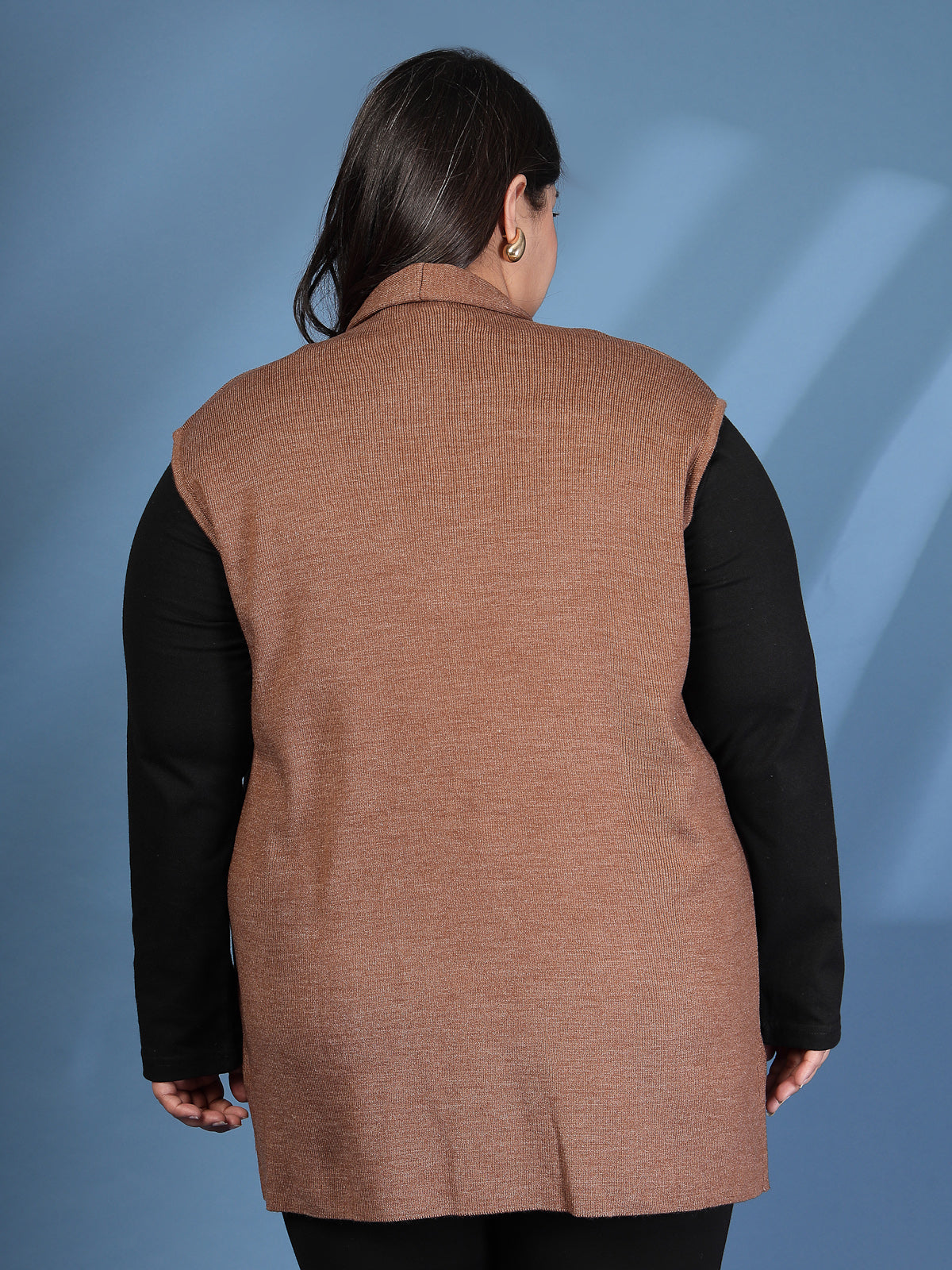 Brown solid sweater vest ,has a lapel collar, 2 pockets, short sleeves, button closure, straight hem