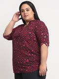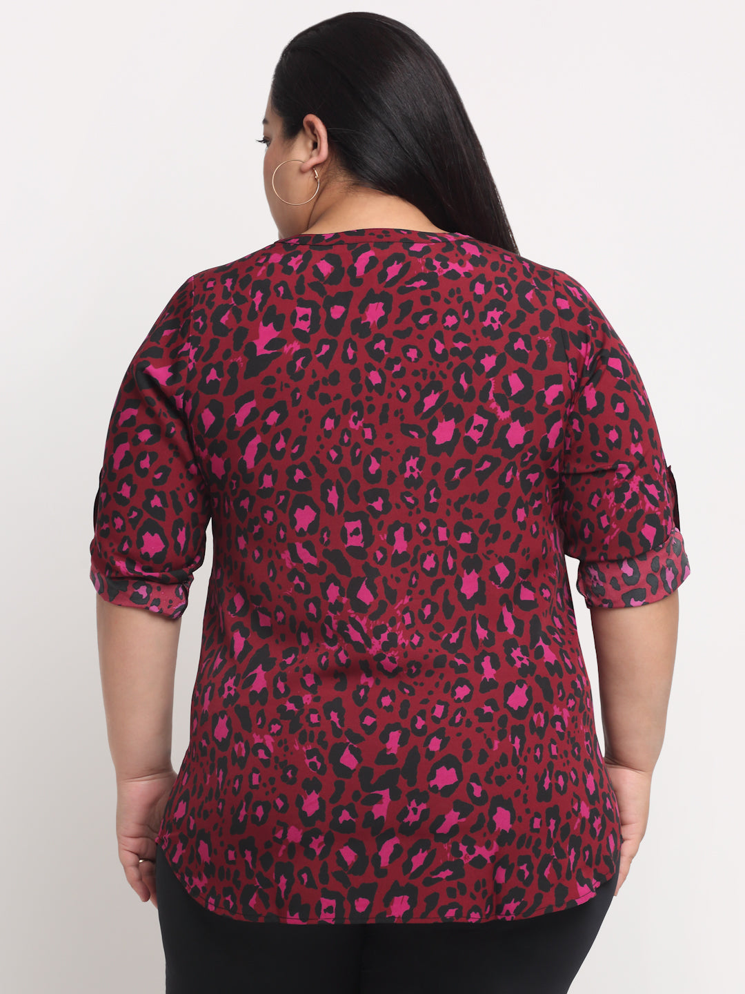 Plus Size Red Floral Print Mandarin Collar Shirt Style Top